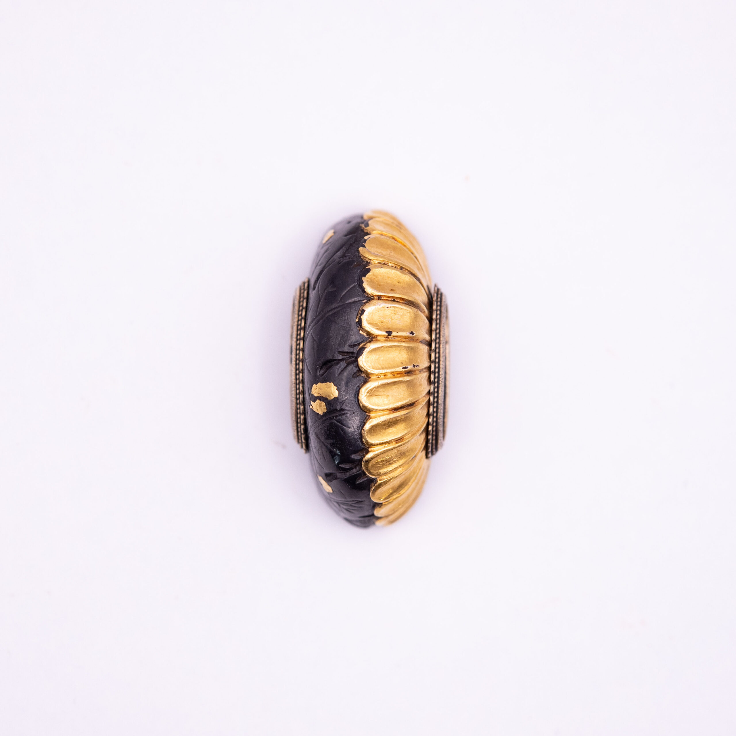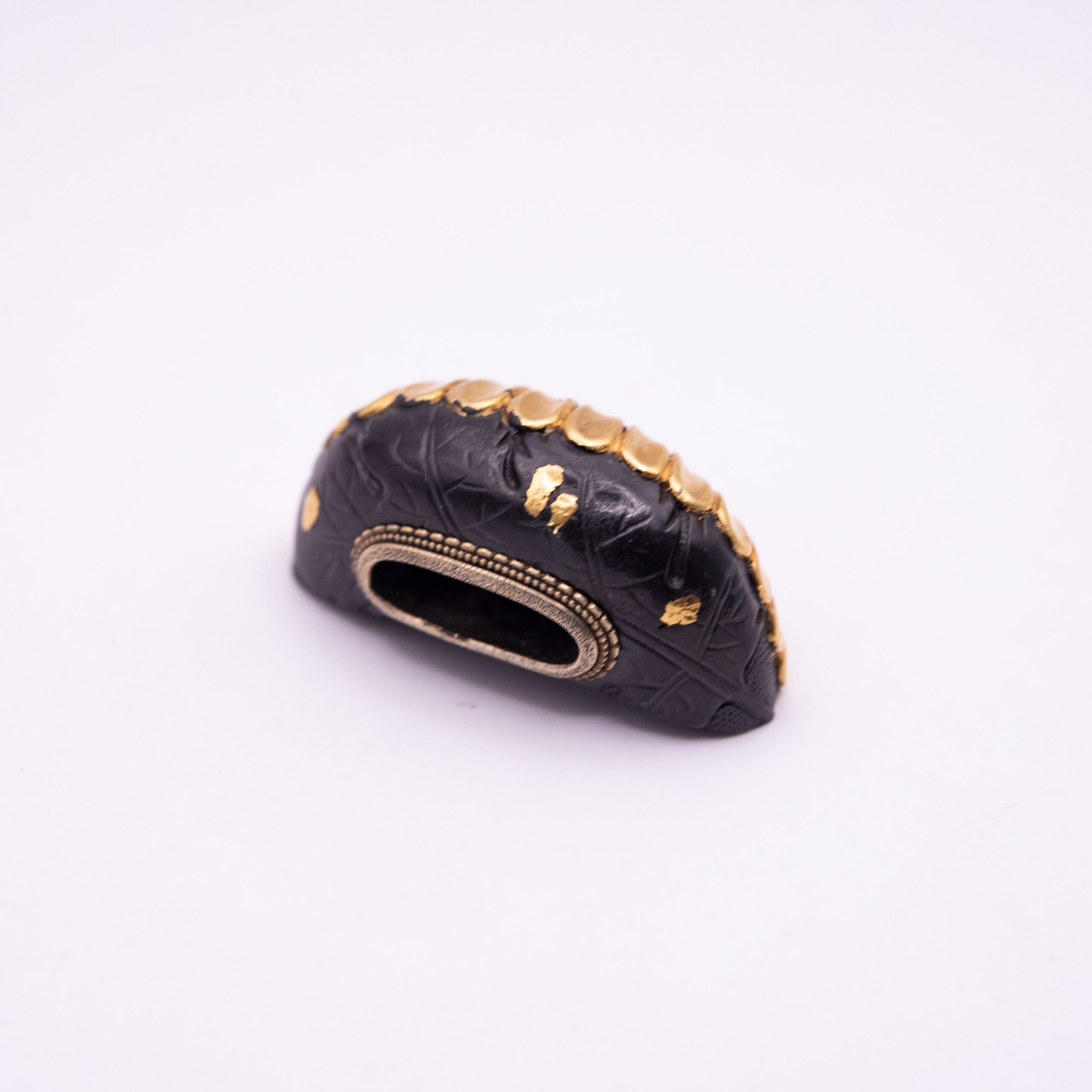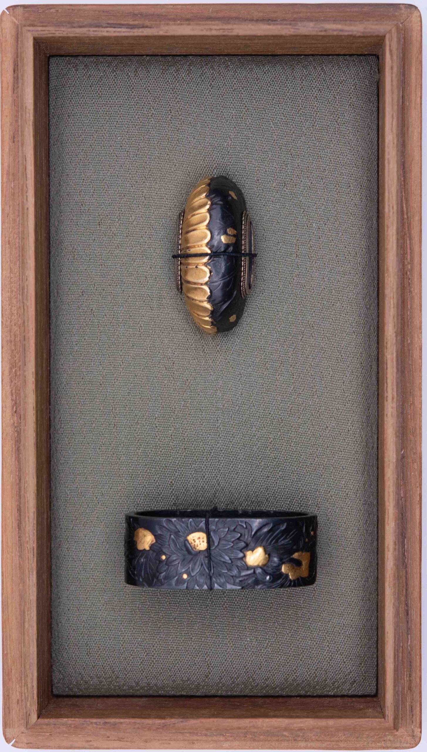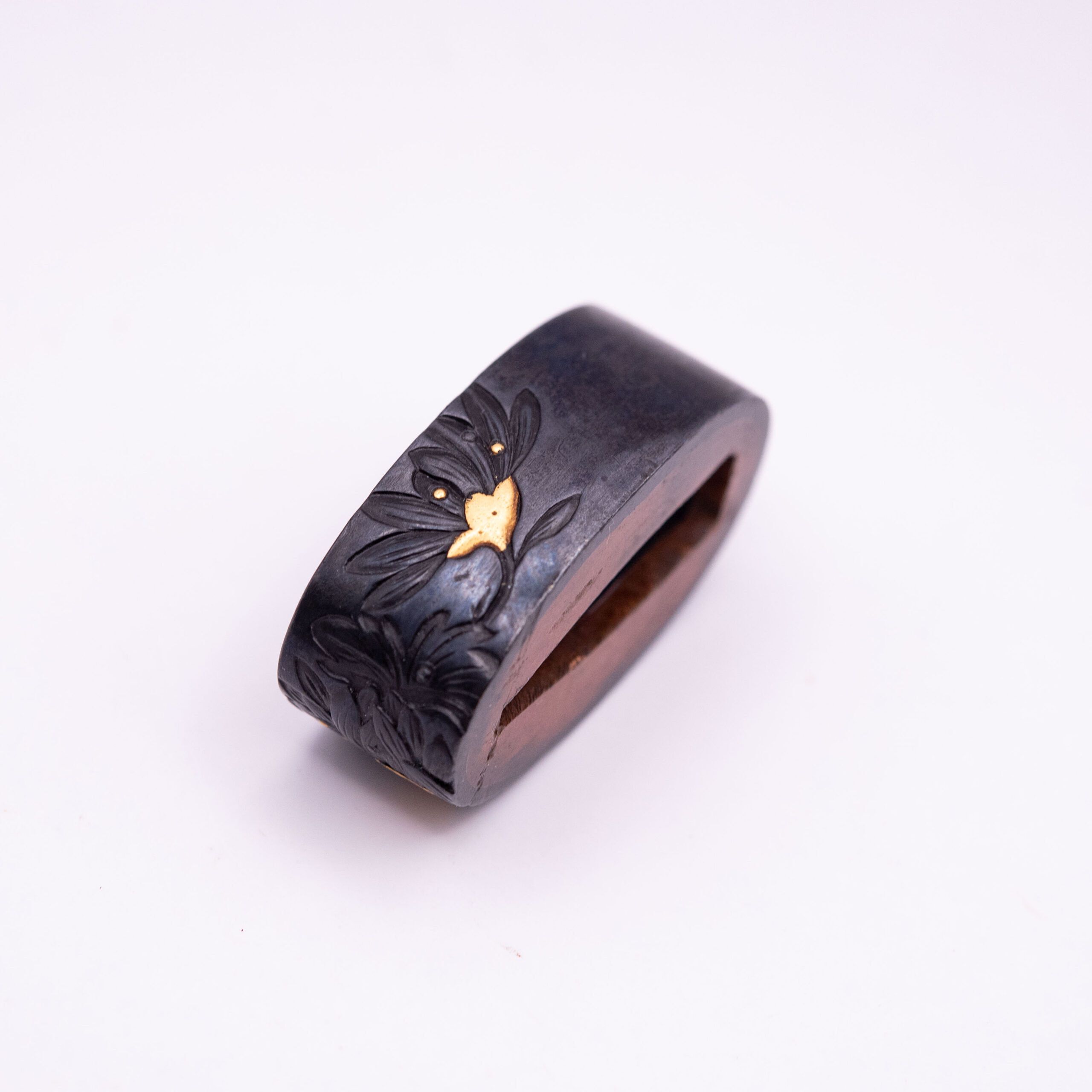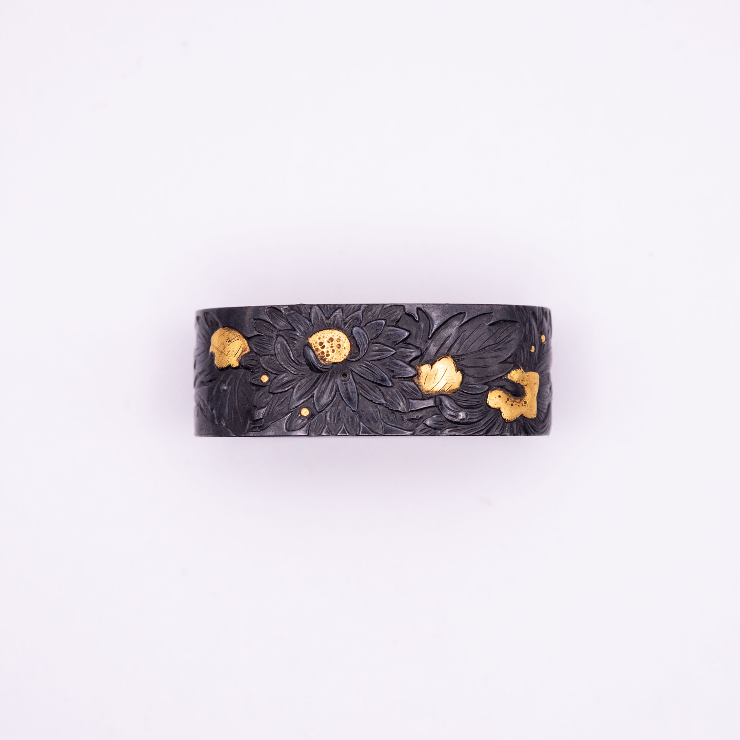 We have here a Fuchi and a Kurikata bearing the design of the chrysanthemum, the flower associated with the Japanese emperor. Both pieces are made from Shakudo and show gold highlighting. The Kurikata shows half a chrysanthemum blossom covered in gold giving the piece a nice contrast.
