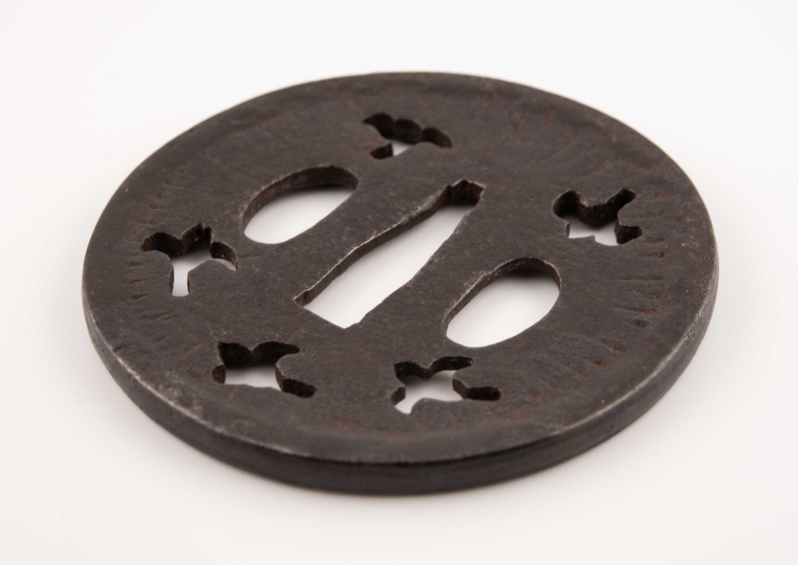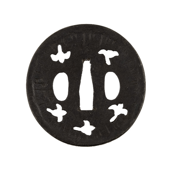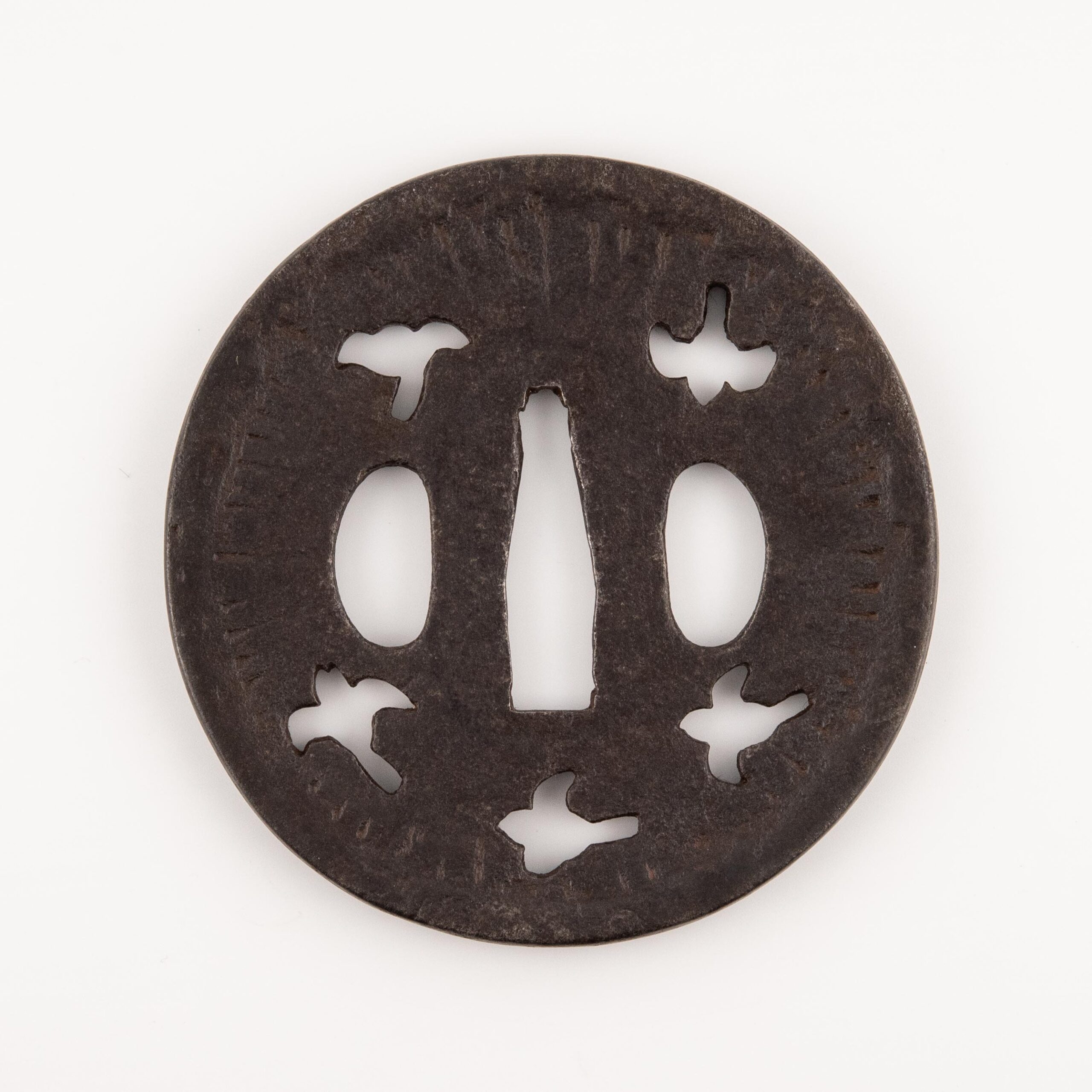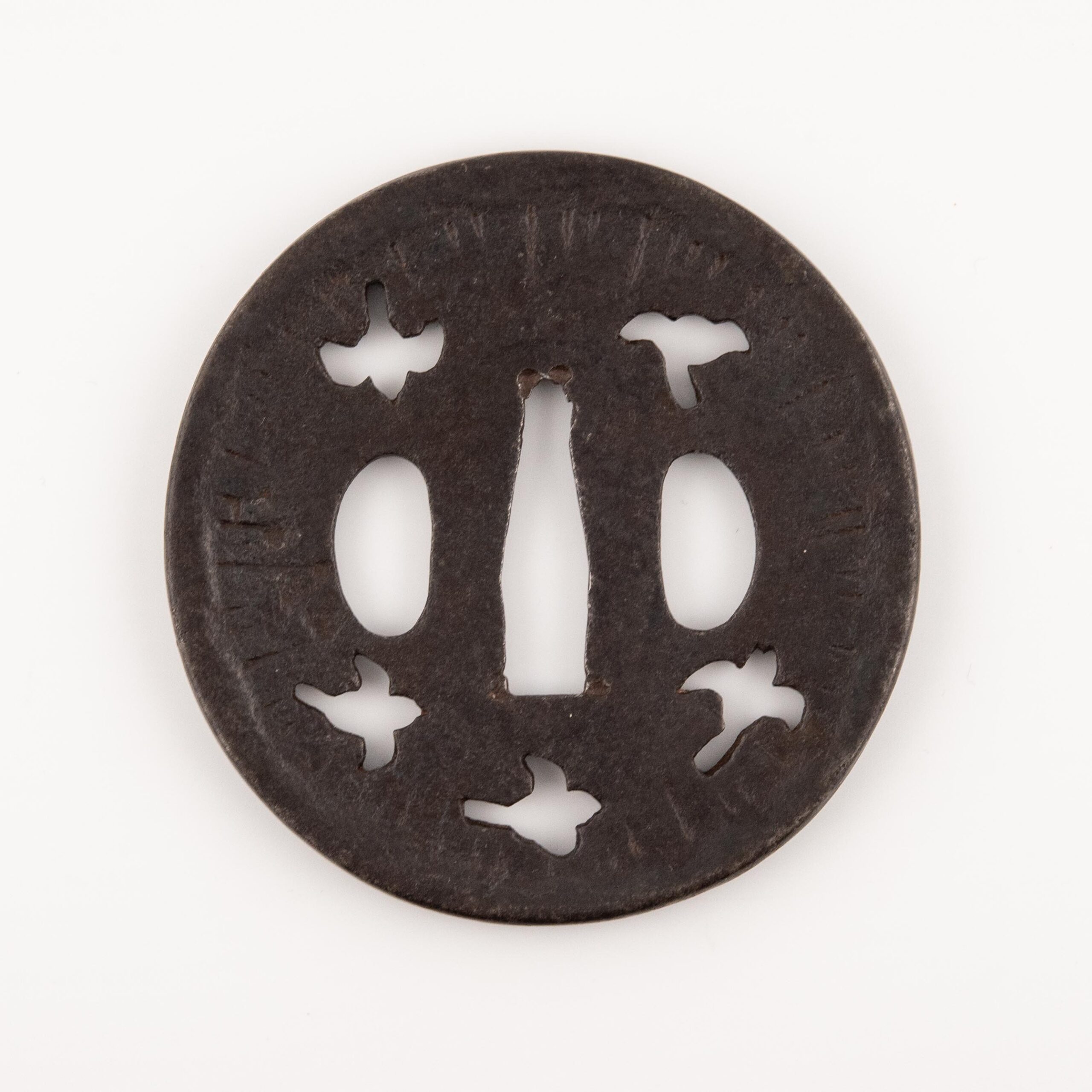 Den Yagyu Tsuba with the design of birds in flight and Amida yasuri