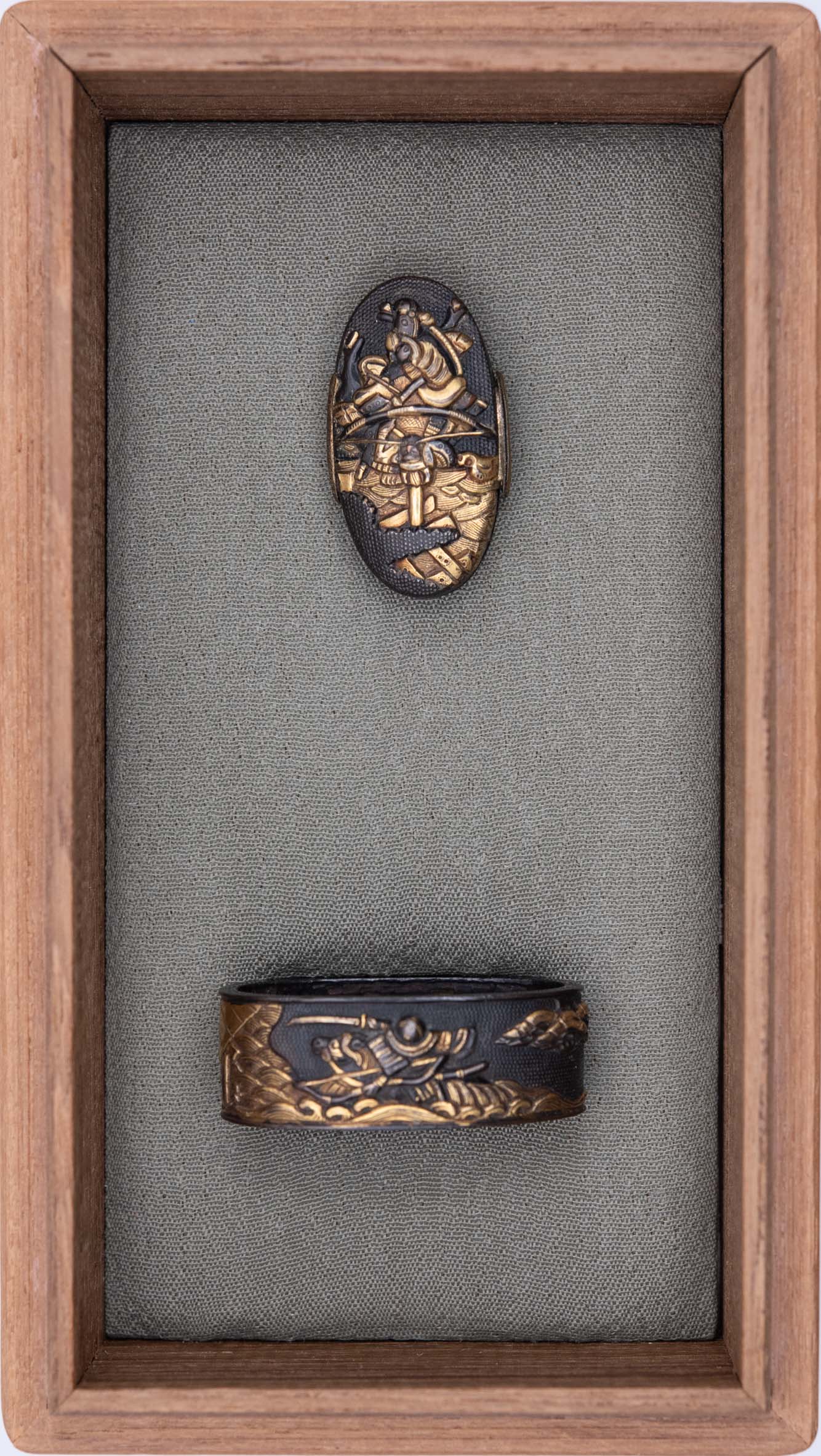 This piece is made of Shakudo with gold highlights in Keshikomi zogan technique. The background is worked in linear Nanako and the the details of the Samurai on their horses are quite elaborate.