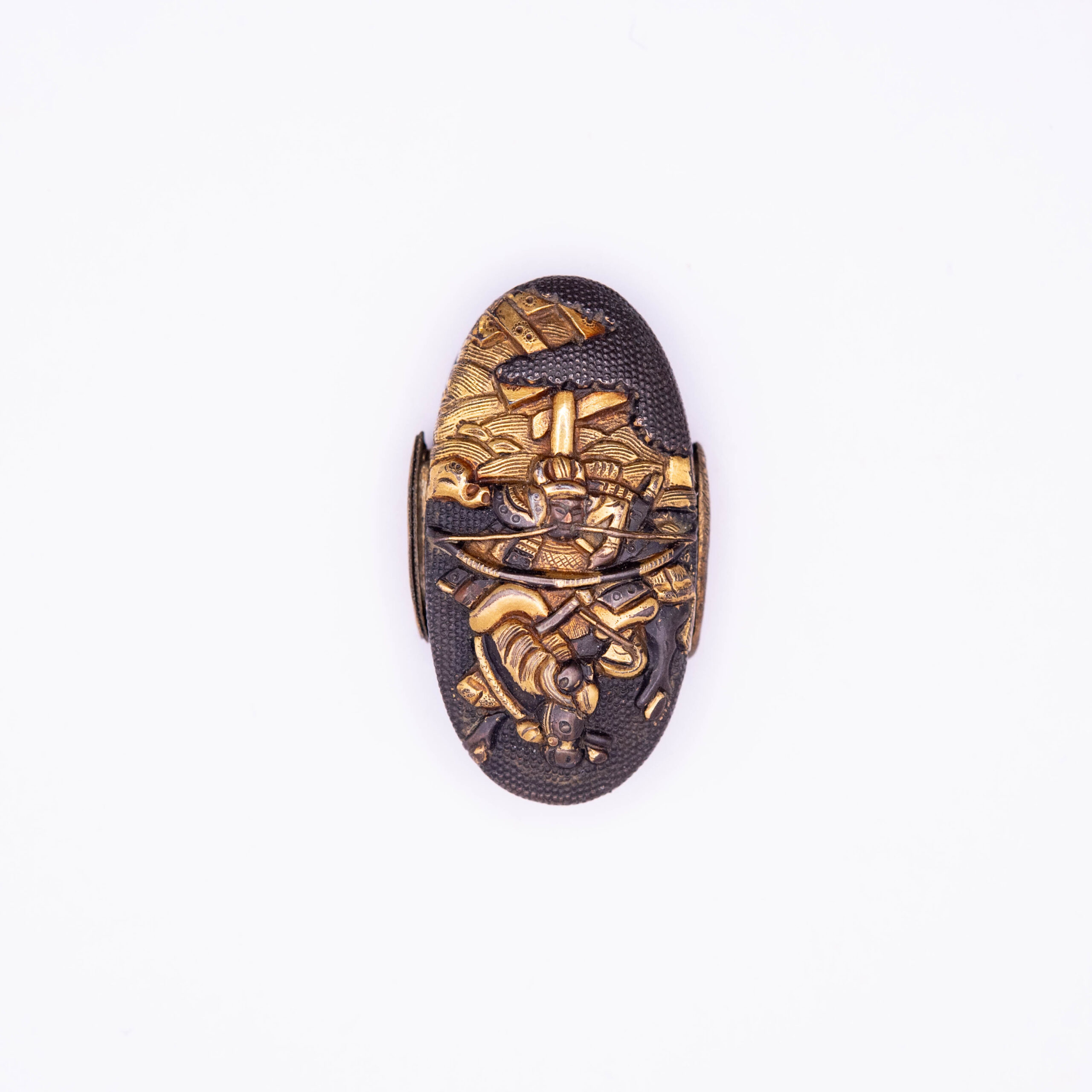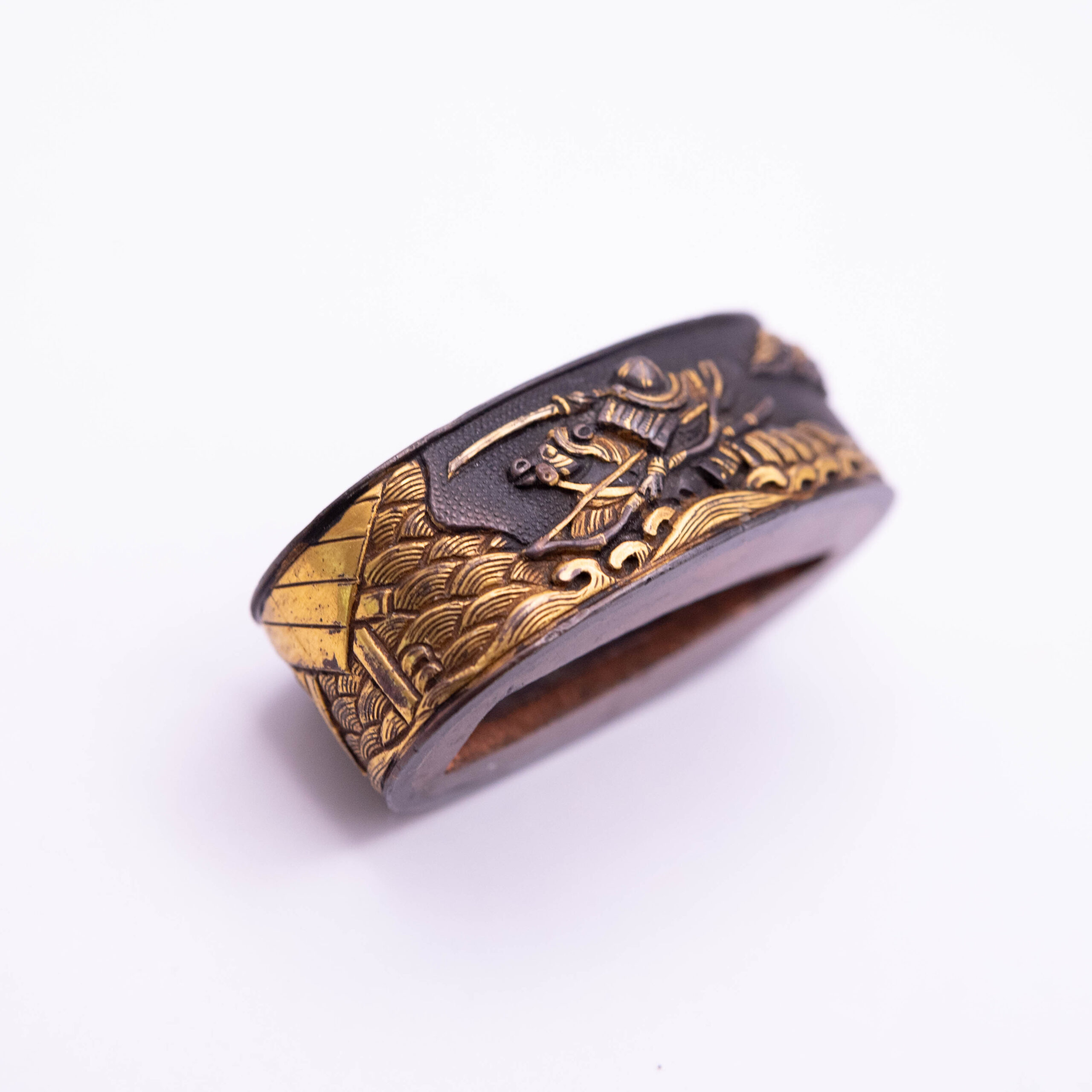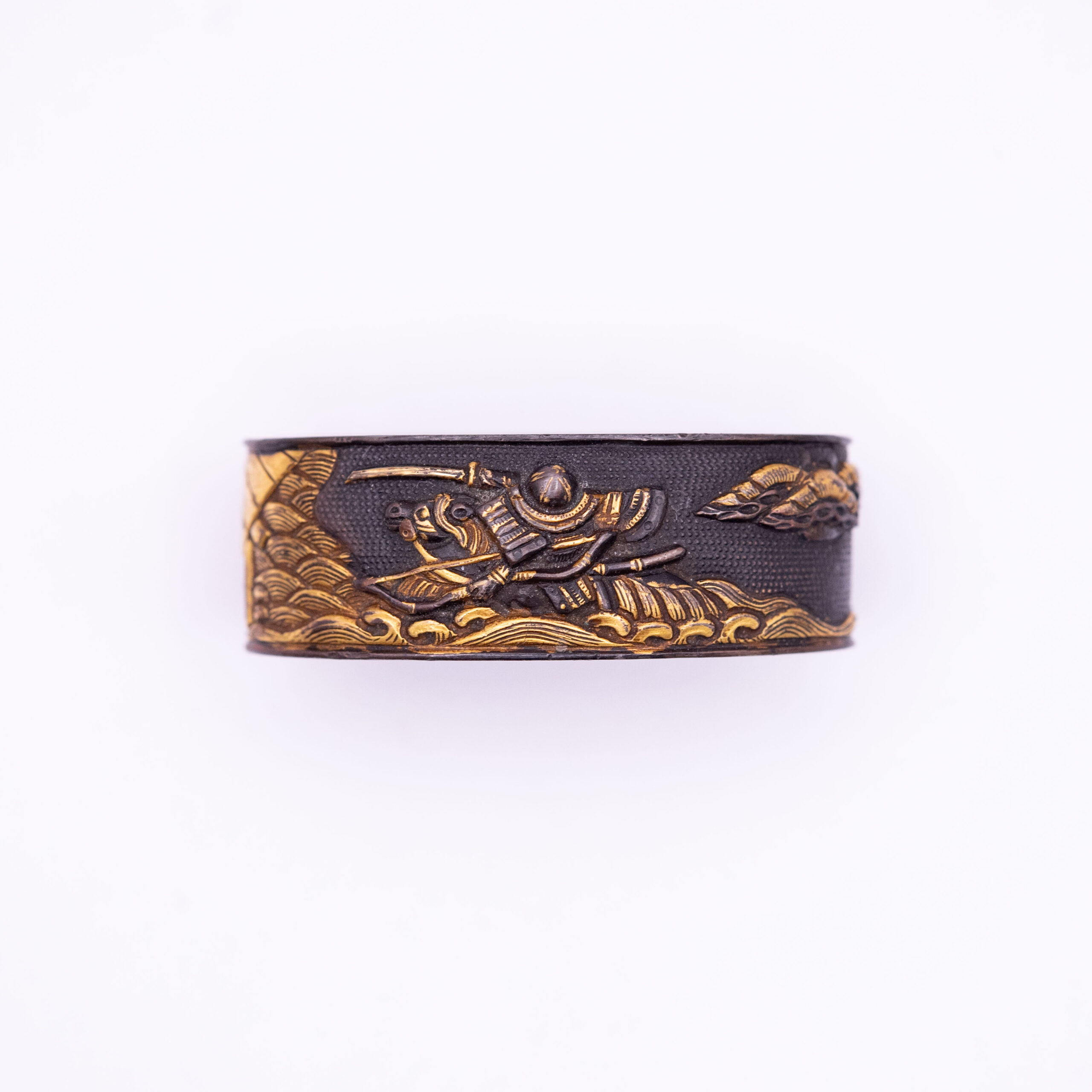 This Fuchi Kashira depicts the famous story of the battle at Uji River. In this legend, after discovering that the bridge was dismantled, two Samurai chased through the Uji river to show their allegiance to their lord.
