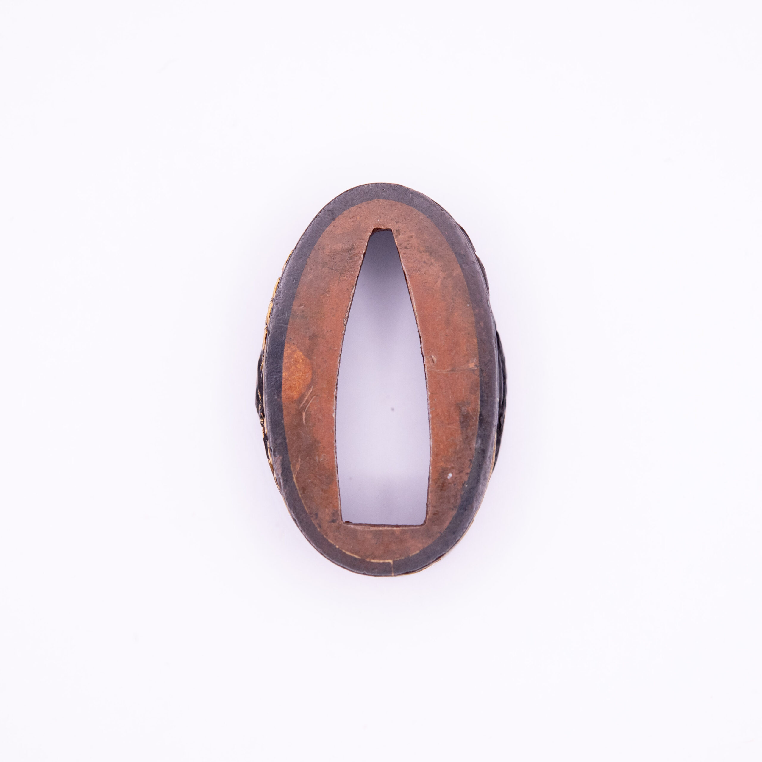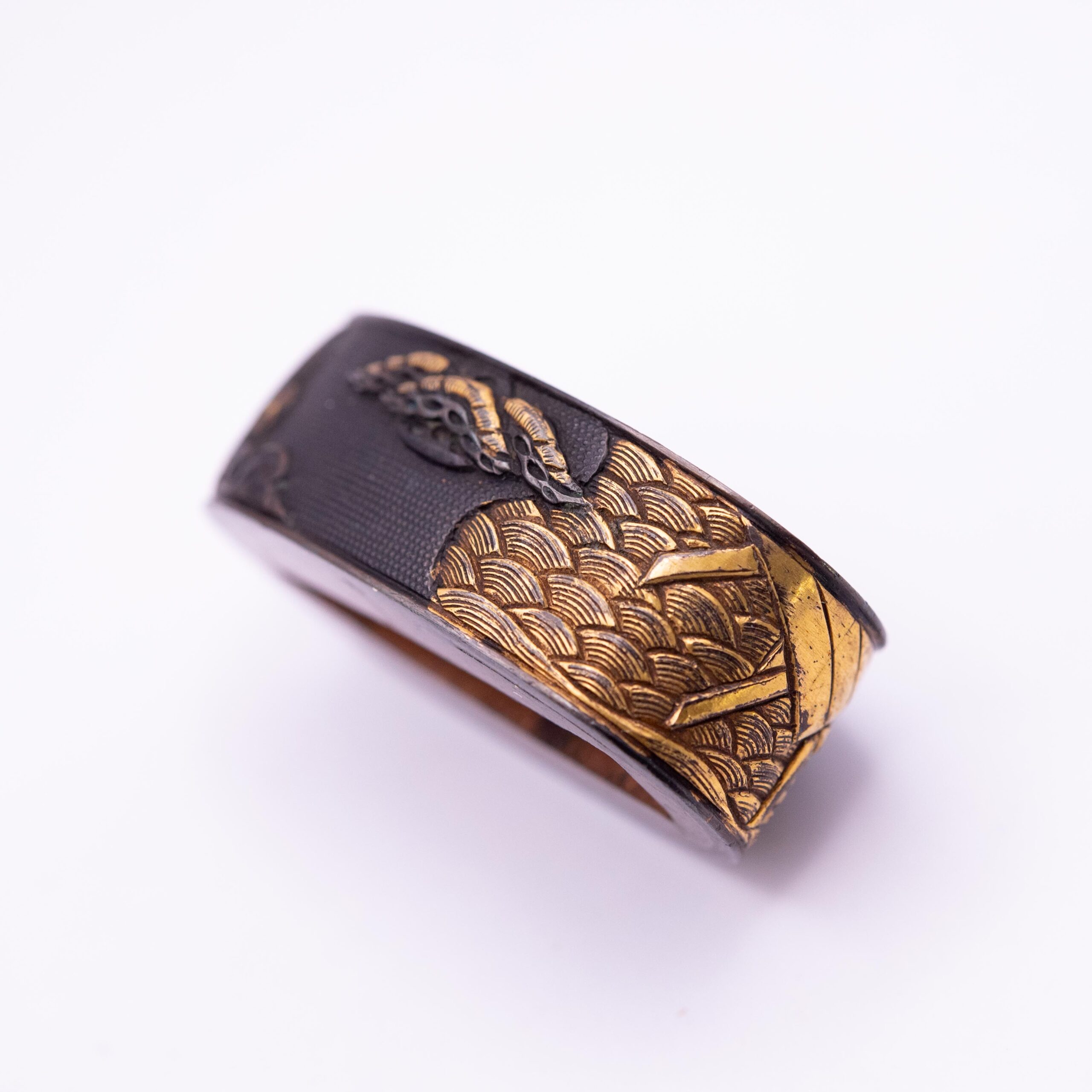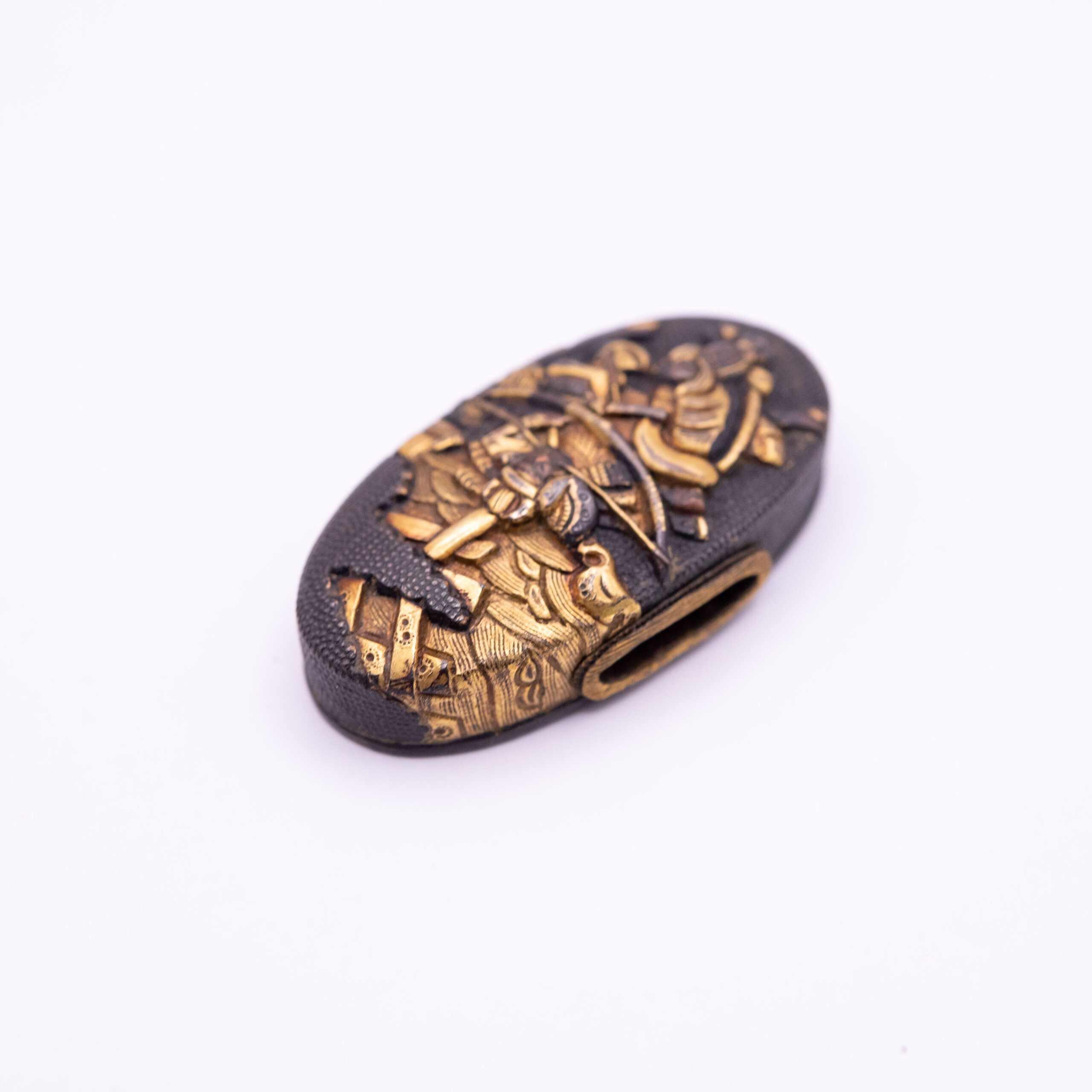 This Fuchi Kashira depicts the famous story of the battle at Uji River. In this legend, after discovering that the bridge was dismantled, two Samurai chased through the Uji river to show their allegiance to their lord.