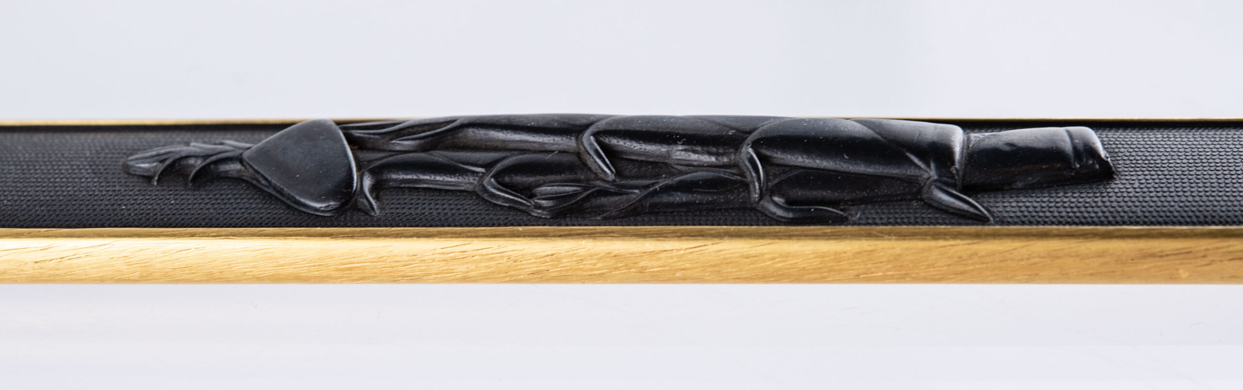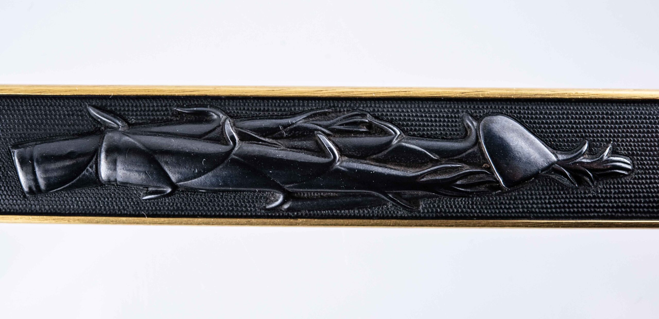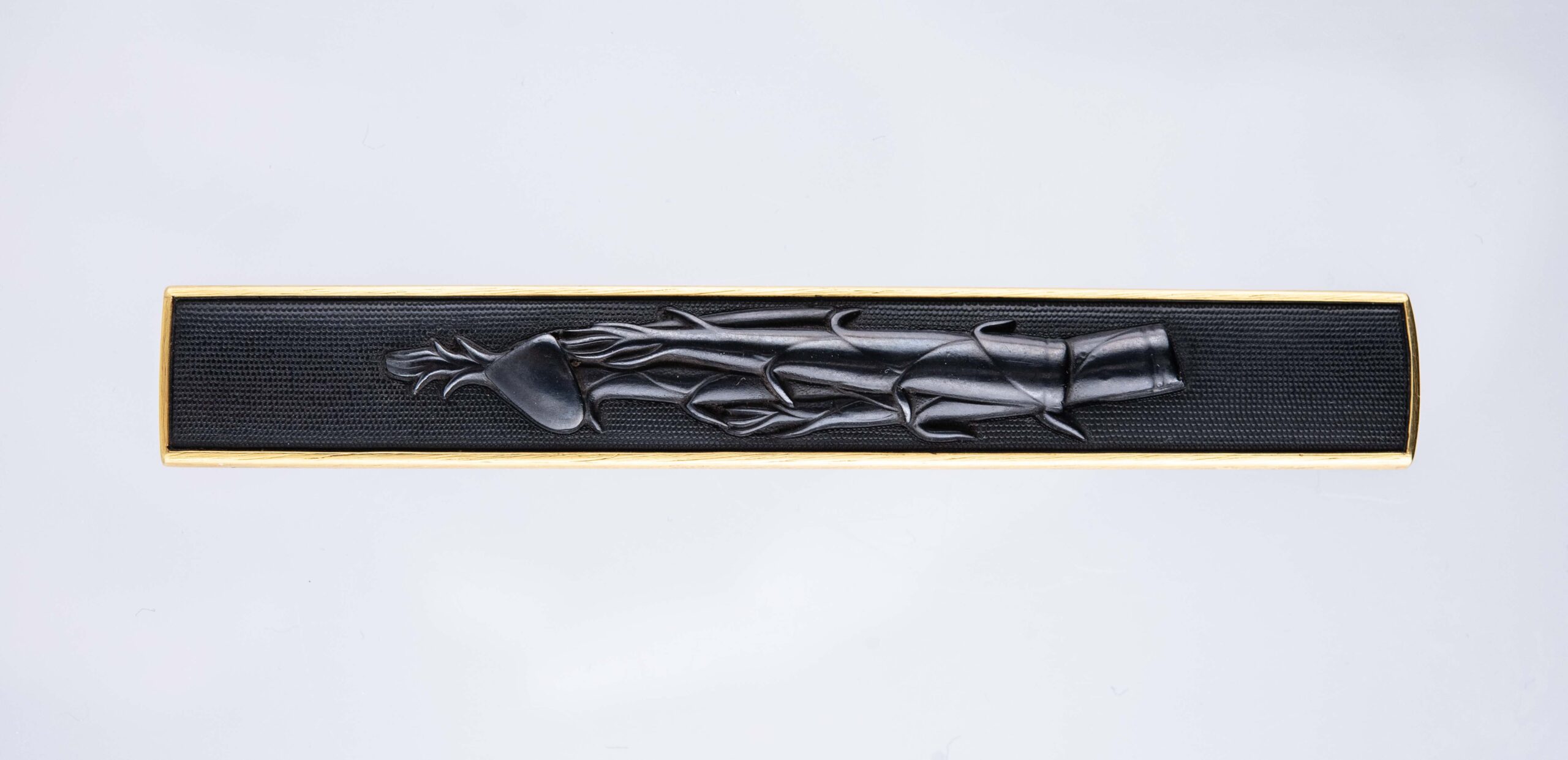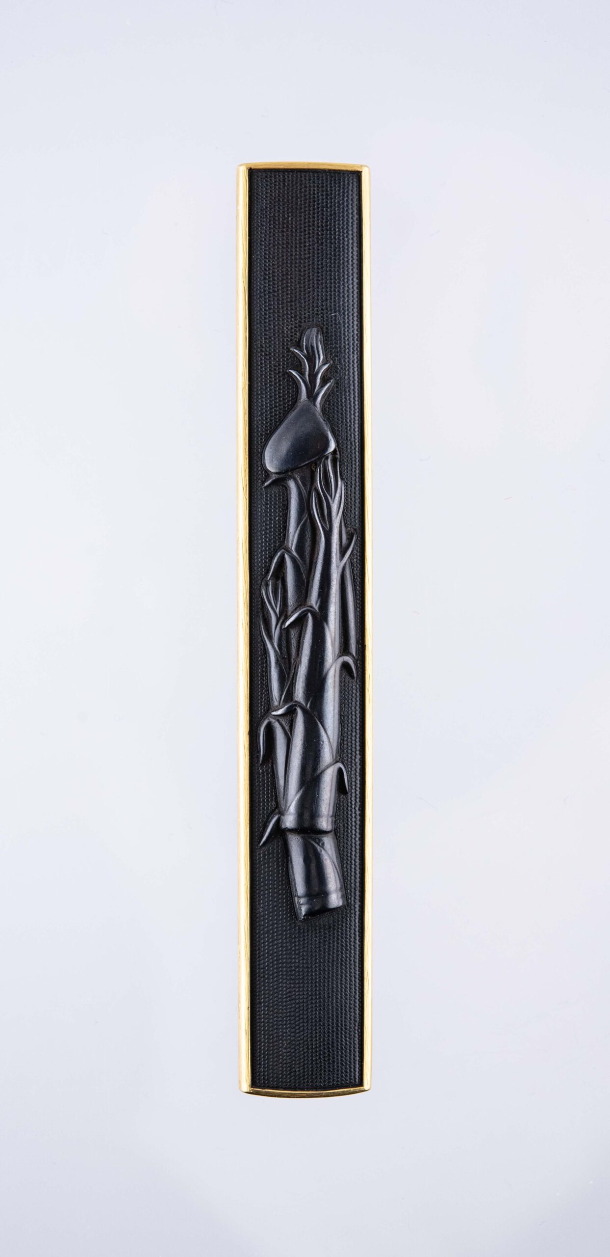 This Juyo Kozuka depicts young bamboo shoots, and a hoe. These two together represent the story of Moso, a well-known tale of filial piety that circulated widely in East Asia and is also found in Japanese tale collections. In this tale, a man named Moso is devoted to caring for his dying mother who craves for a last supper of bamboo shoots. Though it is winter and bamboo shoots do not grow in that season Moso travels miles through the snow to find some. When finally he starts digging in the snow, the gods show mercy and miraculously some young bamboo shoots appear. He heads home and fulfills his mother’s last wish.