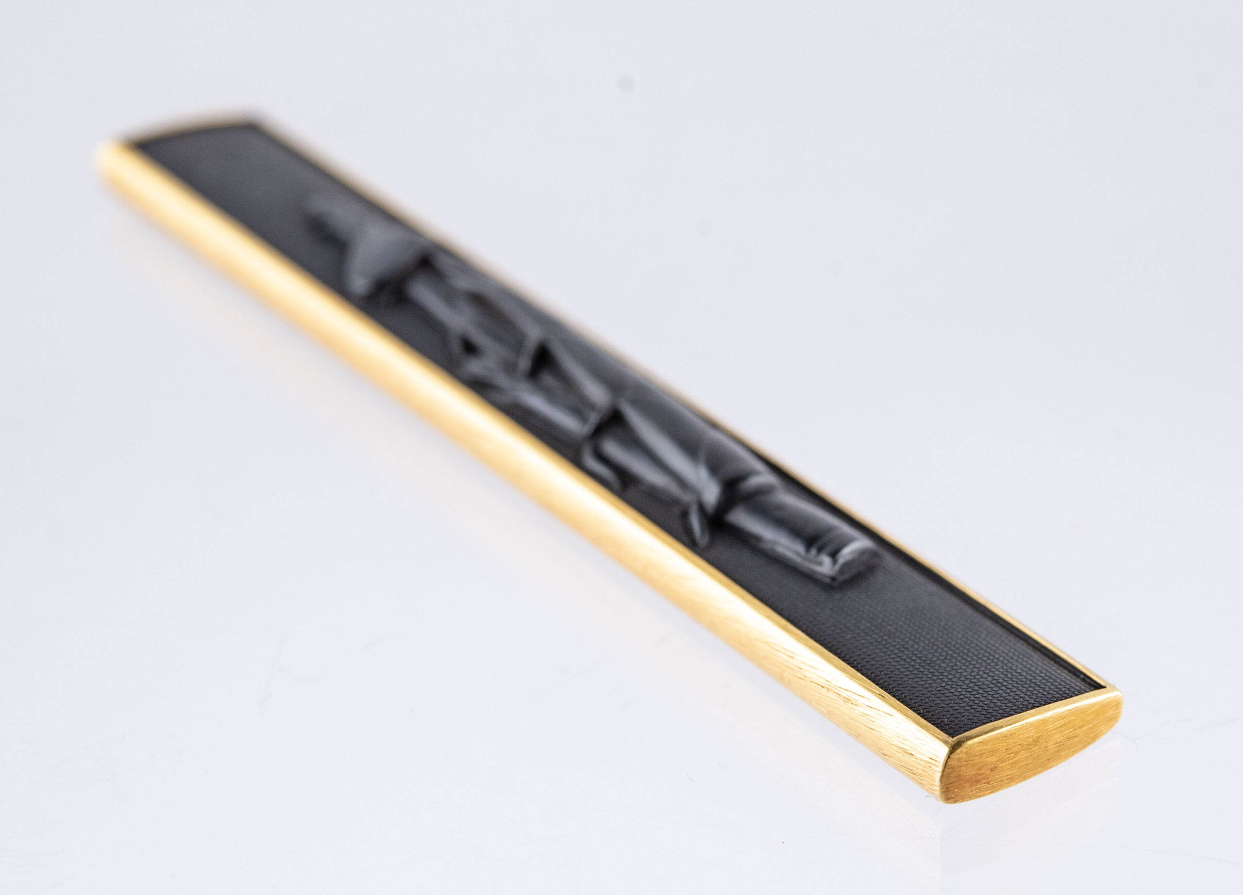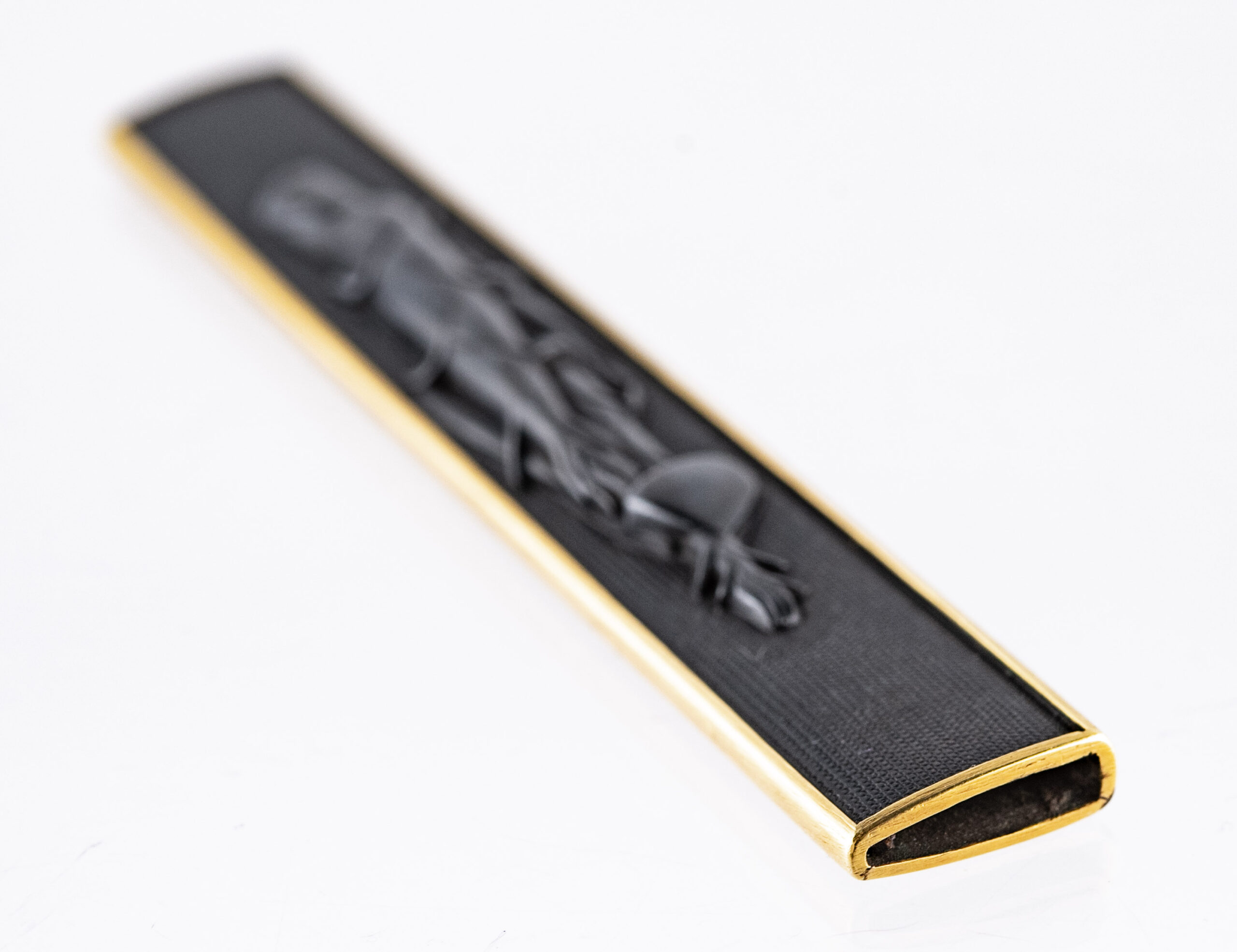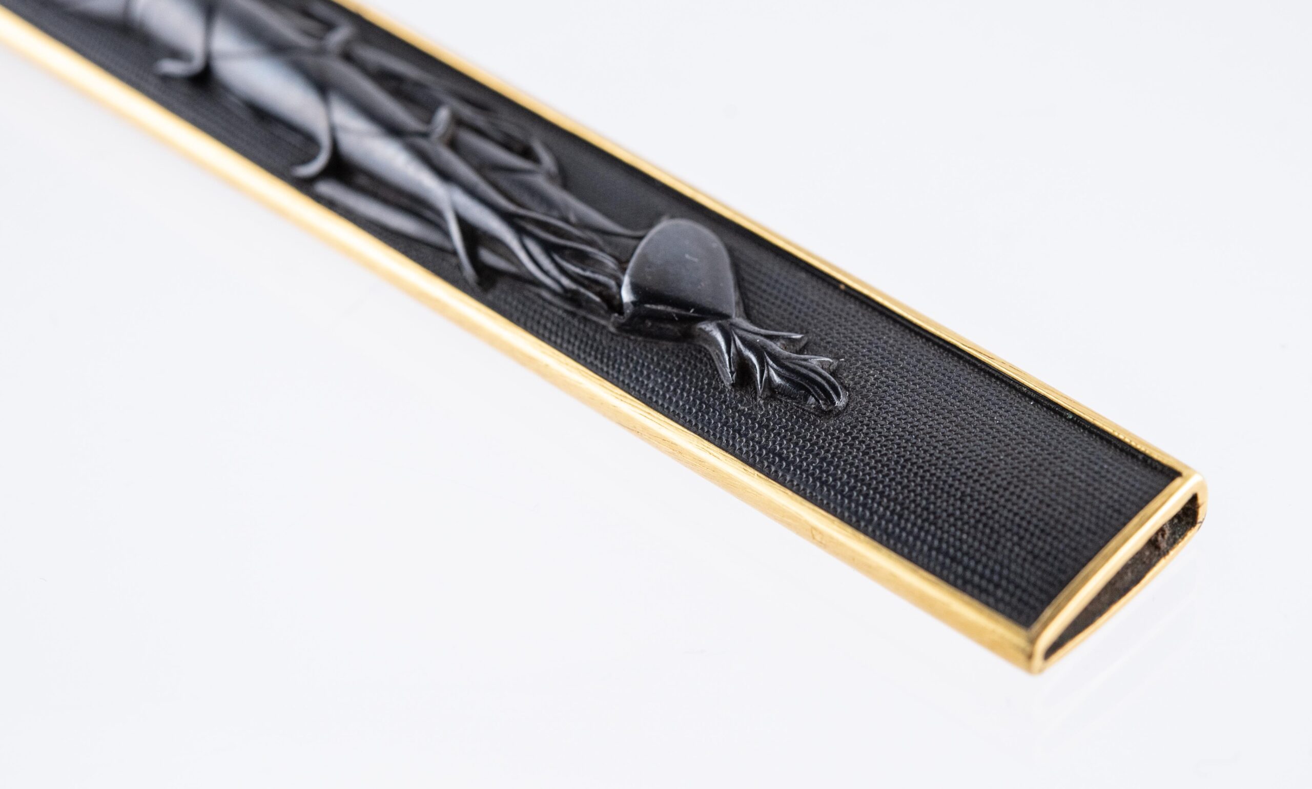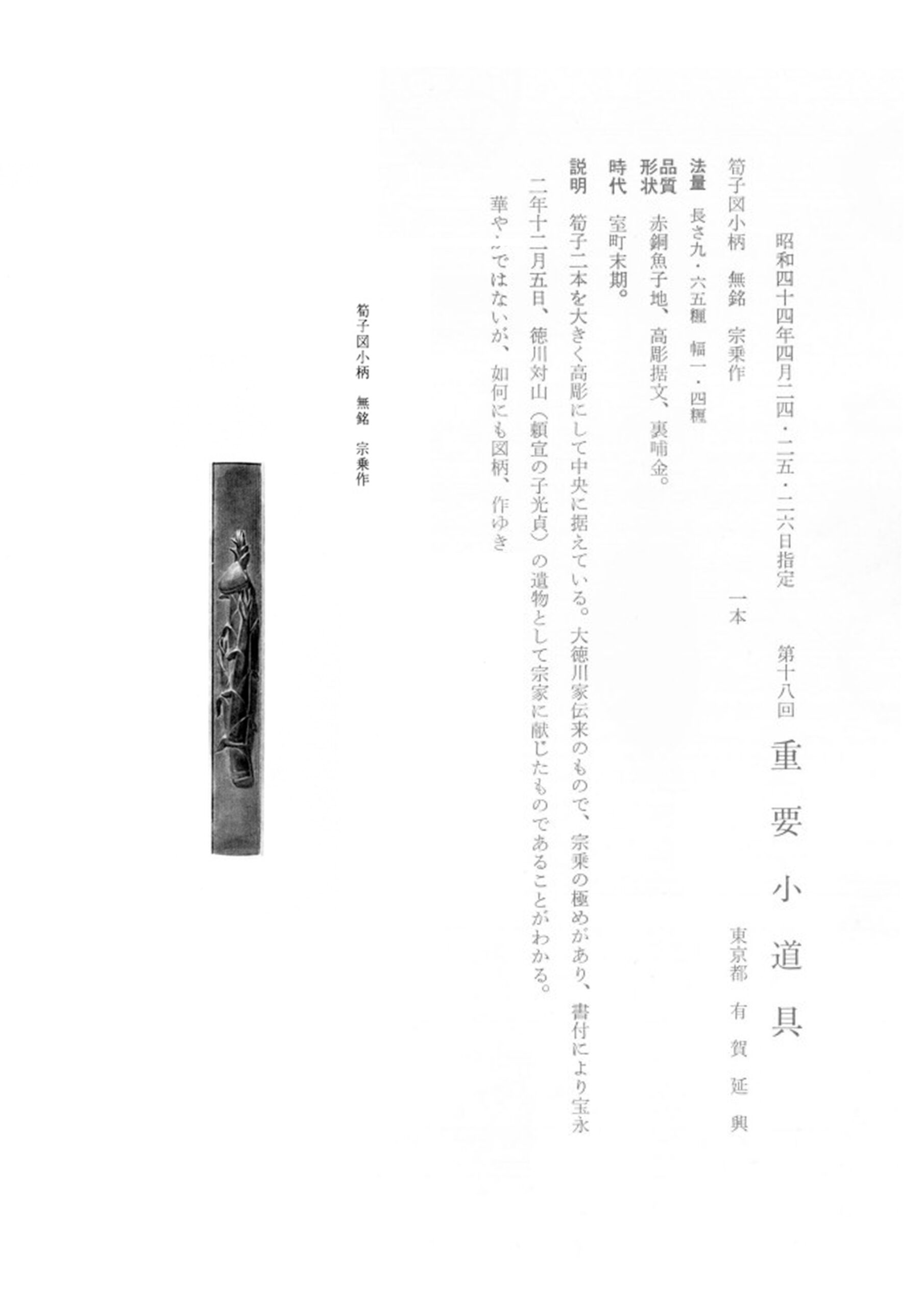 It is said that Kozuka made before the Edo period only depicted horizontal design elements and that Yokoya Somin was the first master to create vertical Kozuka designs. However, as we can also see from the direction the Kozuka is depicted in the Juyo paper, this piece might already have been made with a vertical design long before Somin was even born.