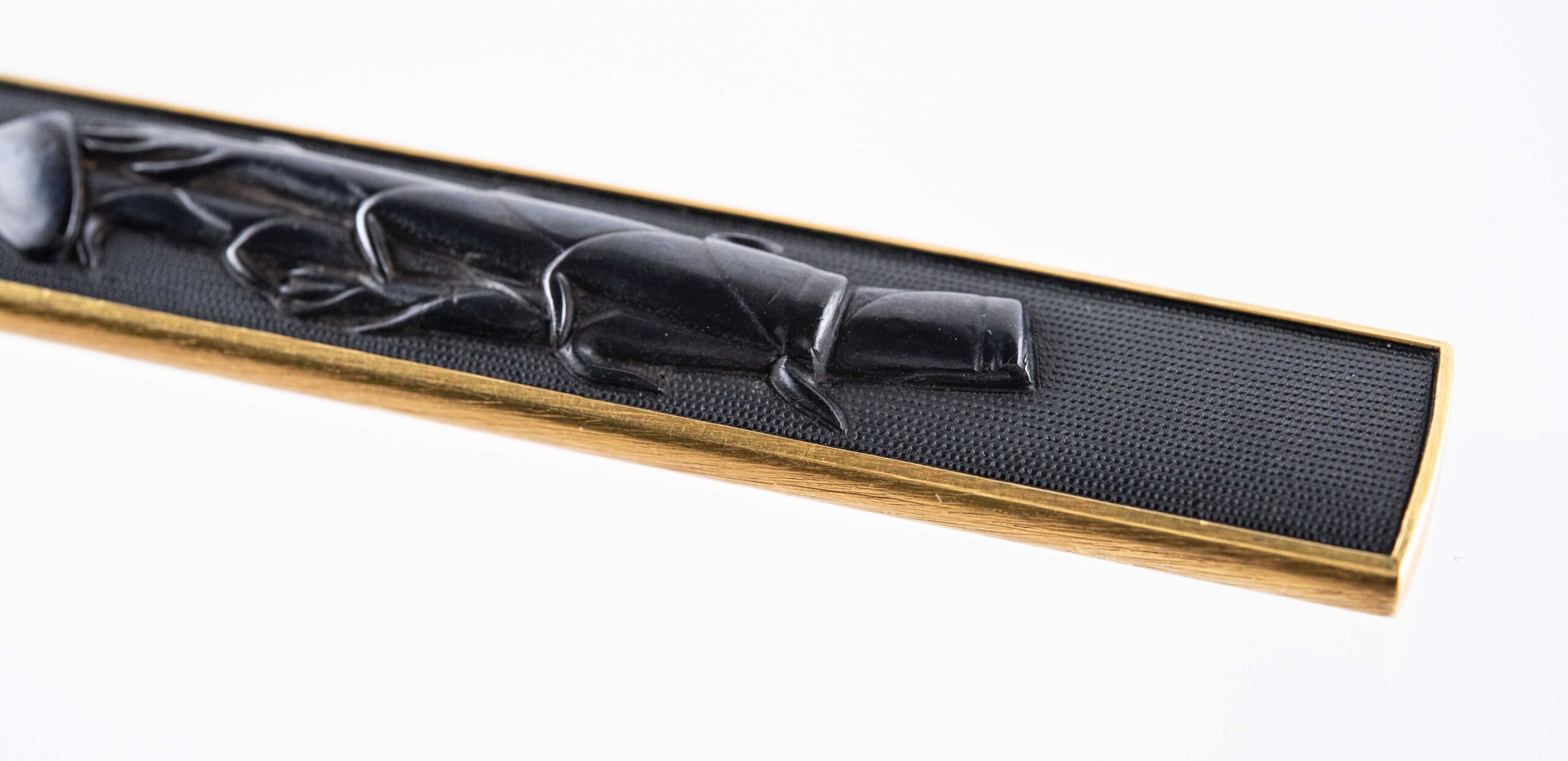 It is rare to see these large designs by Sojo which cover almost the entire plate of the Kozuka and the high relief work creates a beautiful strong and elegant impression. The deep black shakudo speaks for a high percentage of gold of at least 5 % being used.