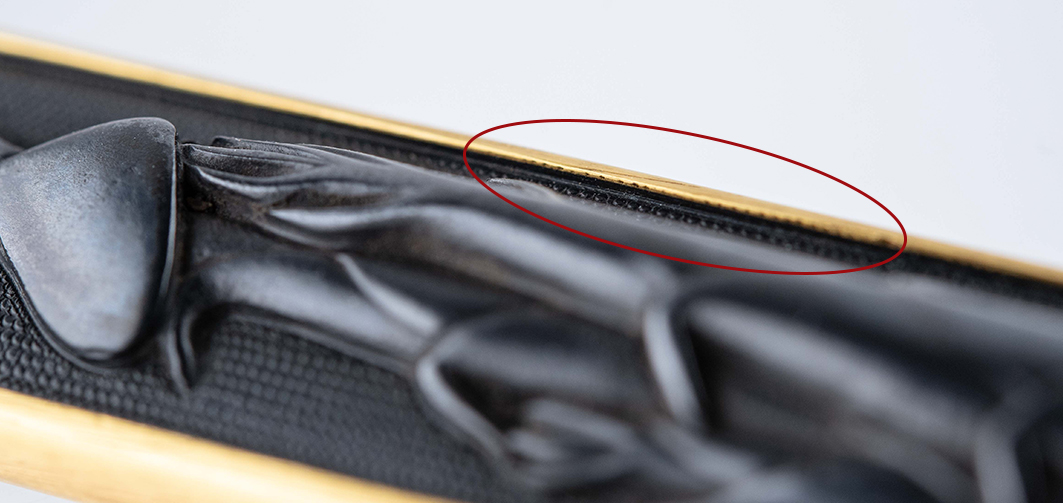 As already pointed out, this Kozuka has been preserved over 500 years with little or no wear. It was made from Shakudo covered with gold foil which bears the typical fine yasurime of the early Goto. The Mon is made in takabori technique where the design element is created from the base plate by hammering down the surrounding area. A very important trait and almost invisible to the naked eye are the small marks along the upper rim of the golden frame (see last picture). These are traces from the Nanako Chisel and are proof of the original condition of this Kozuka. First, they show that the Nanako was made after the gold was attached to the outside in the so called ‘Jibori Suki Sage’ technique, which was only used until the Momoyama jidai, and second they are proof that the gold has not been replaced later and the piece was never restored by a later master thus retaining its original appearance over the centuries.