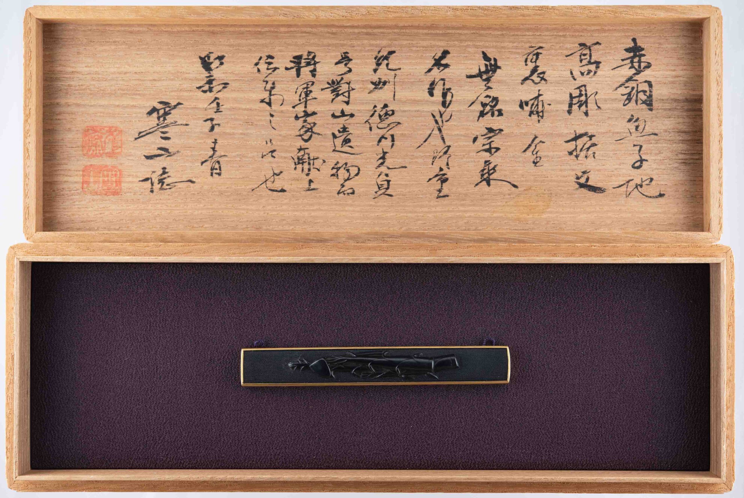 As the Juyo certificate states, this Kozuka was part of the Tokugawa collection and was donated as being a relic from the possessions of Tokugawa Mitsusada, who became the eighth Tokugawa Shogun in 1667. A copy of the document supporting that fact is attached and can be seen in the pictures. The donation happened 320 years ago at a ‘commemoration of the sacred treasure’ event at the Joso-in in December 1705 shortly after Mitsusada has passed away.