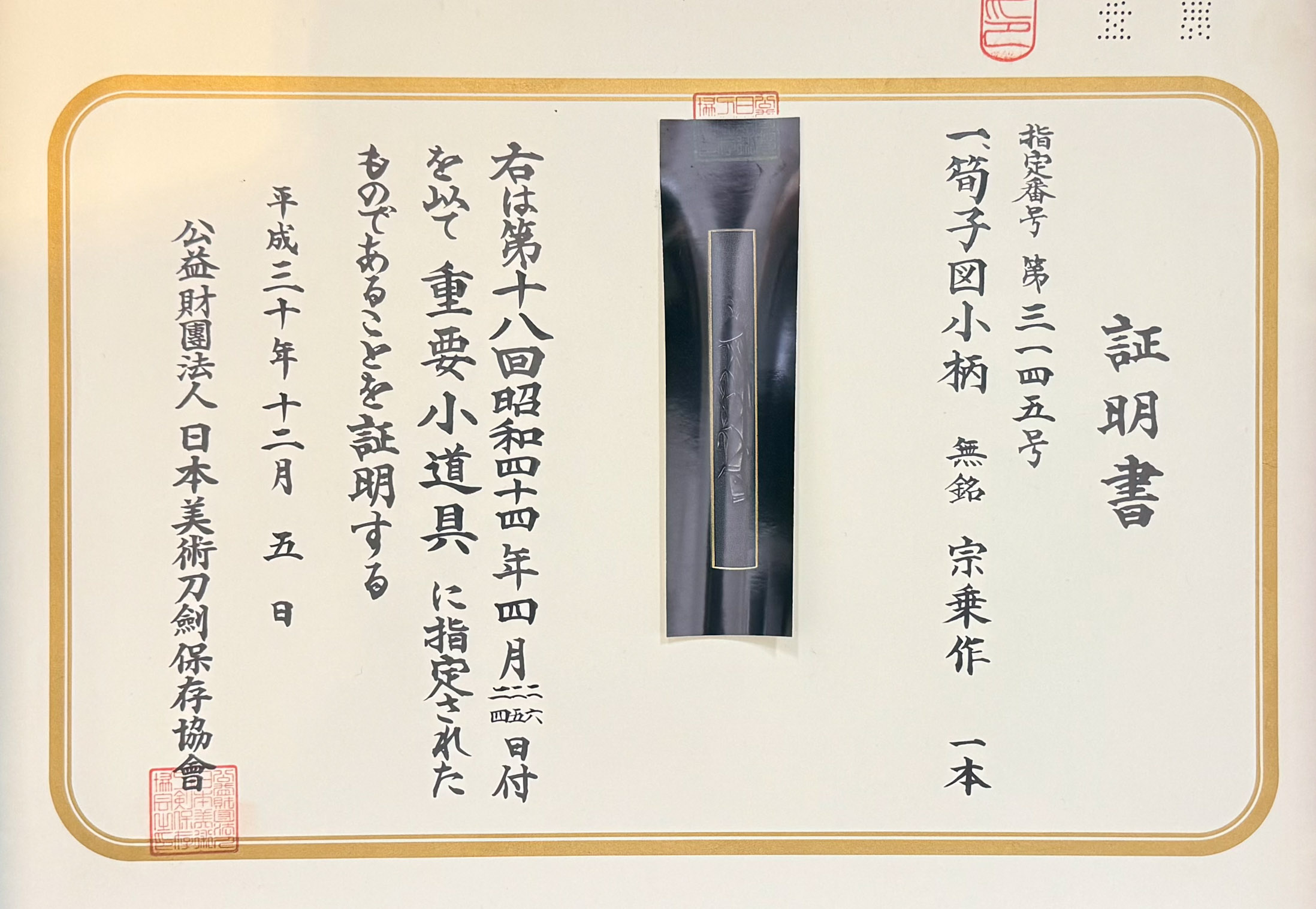 The historical value, the provenience and its condition make this Kozuka a true masterpiece and rare artwork which very well deserves the rank of Juyo Tosogu. This is the third Kozuka from Sojo ever to receive the Juyo Rank in the 18th Juyo Shinsa 1969, April 24.