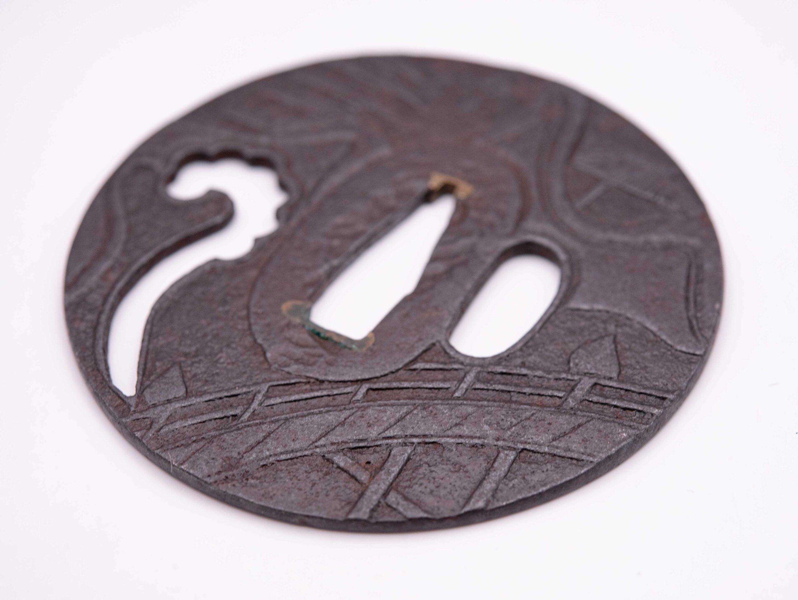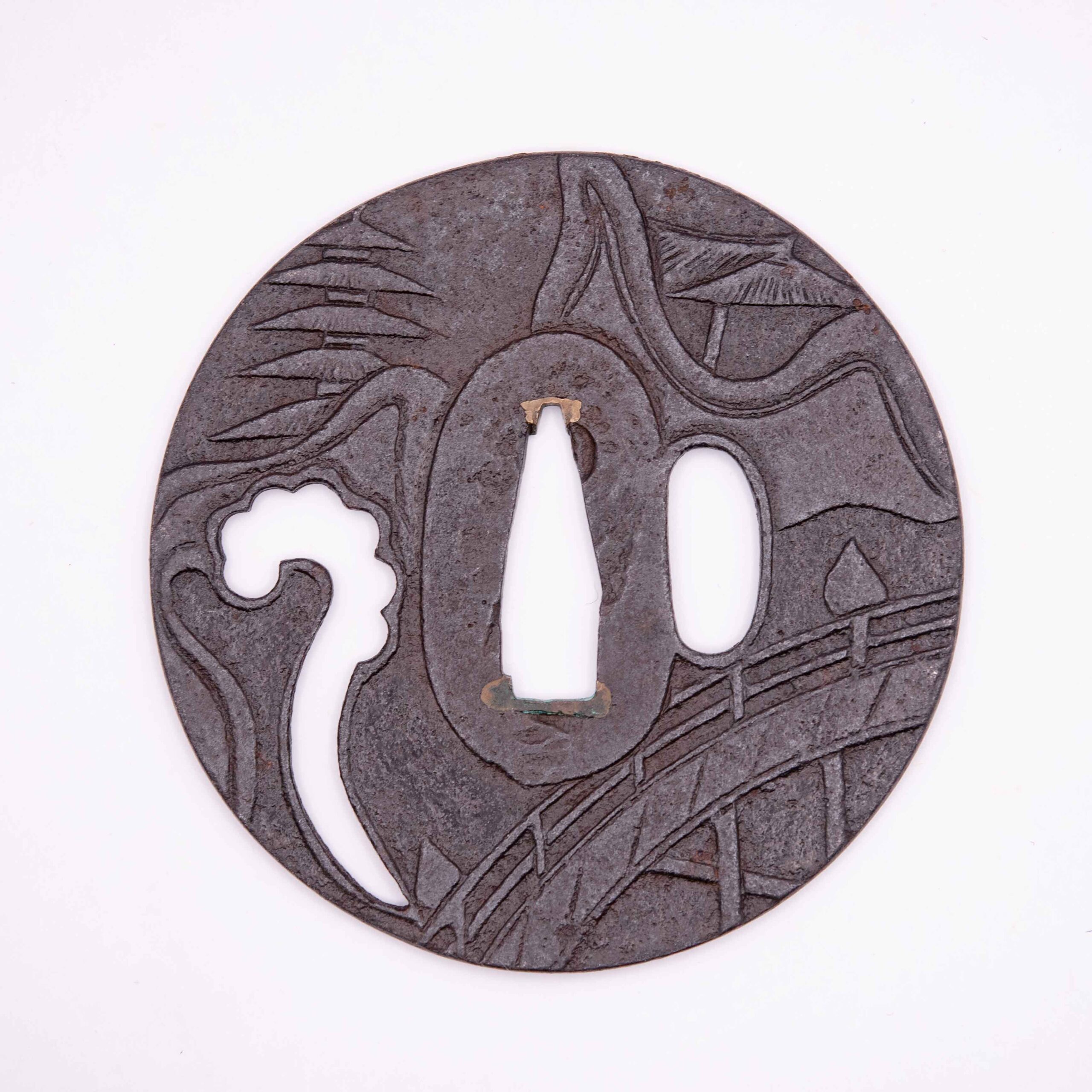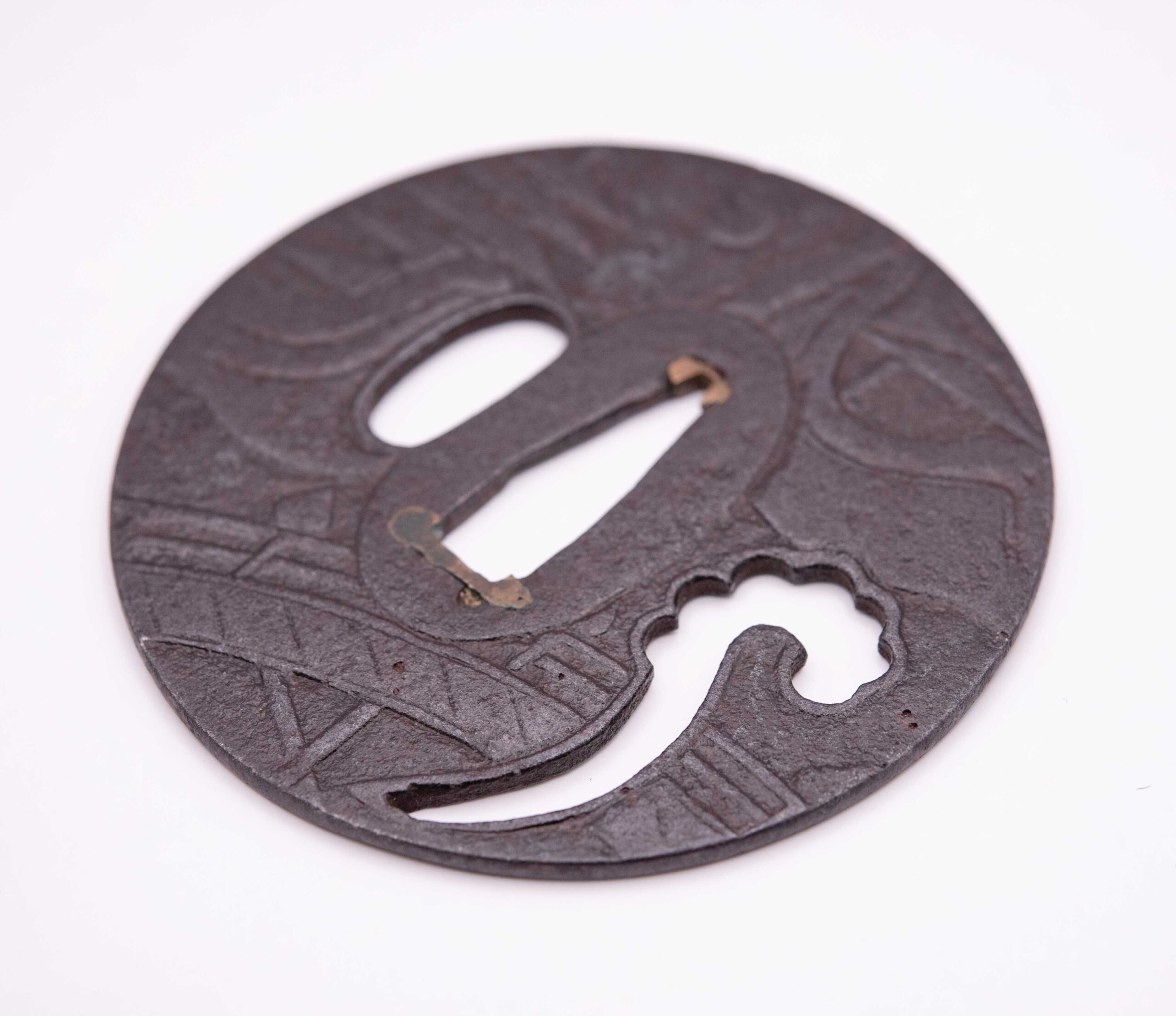 We have here a typical Kamakura Bori piece dating back to the the Muromachi period. The especially flat relief which covers the whole item is characteristic for Tsuba attributed to this group. At the same time they exhibit similar traits as Kachushi Tsuba with their rather thin plate of around 3 mm. Also typical for the early times the Hitsu-ana is slightly elongated.