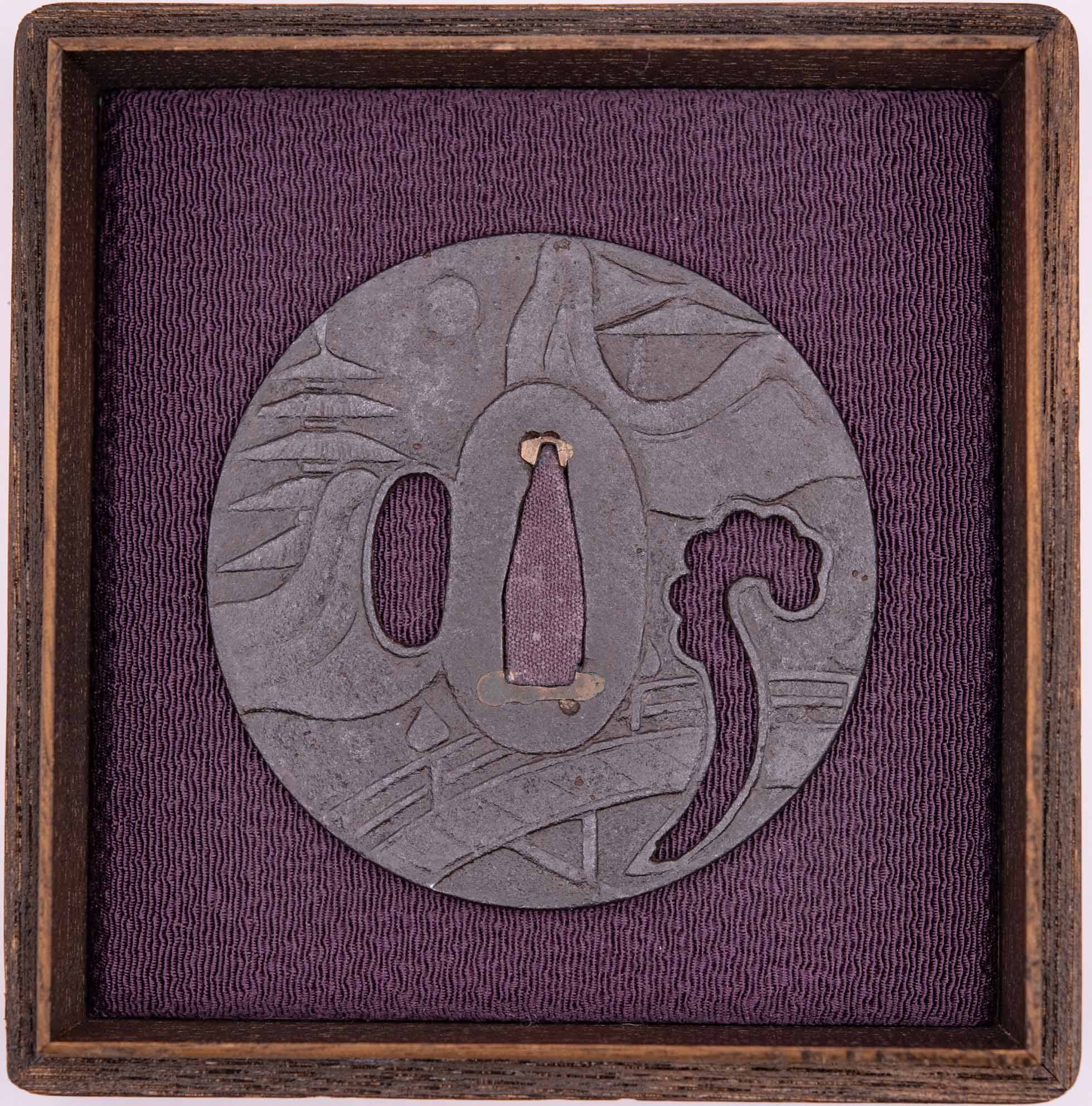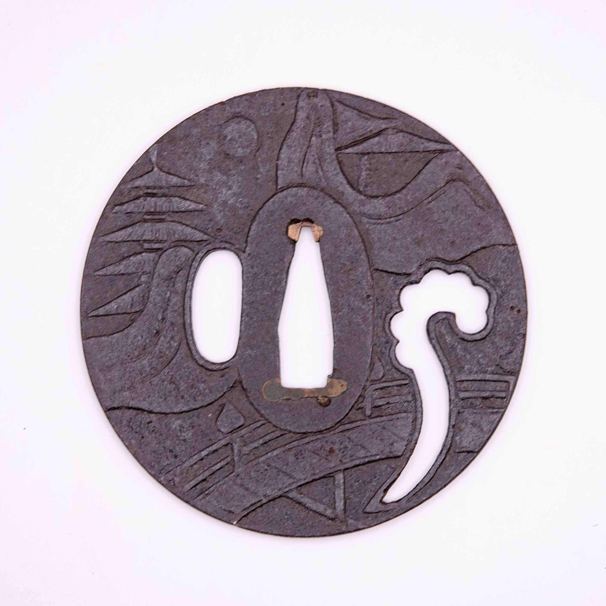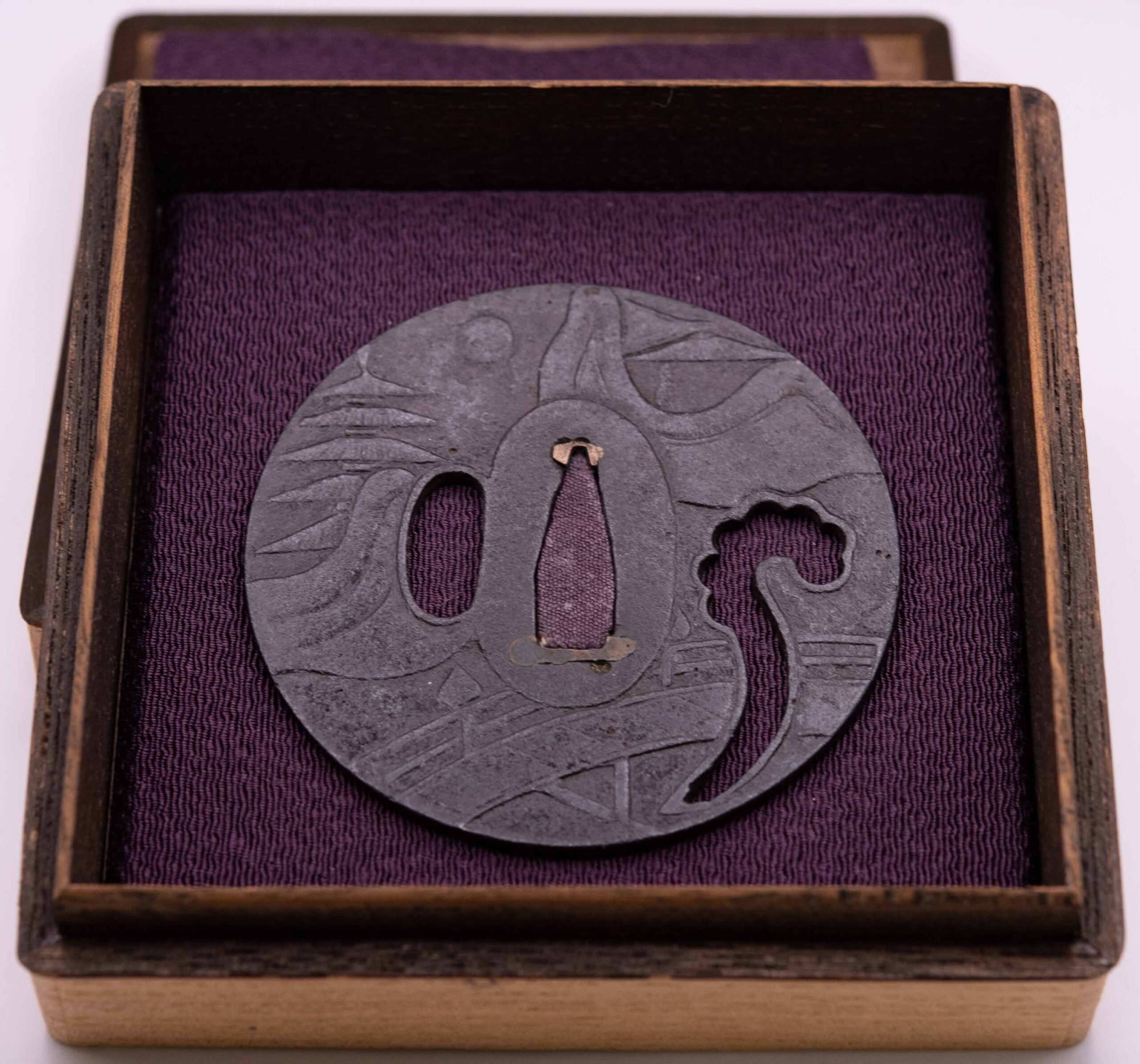 We have here a typical Kamakura Bori piece dating back to the the Muromachi period. The especially flat relief which covers the whole item is characteristic for Tsuba attributed to this group. At the same time they exhibit similar traits as Kachushi Tsuba with their rather thin plate of around 3 mm. Also typical for the early times the Hitsu-ana is slightly elongated.