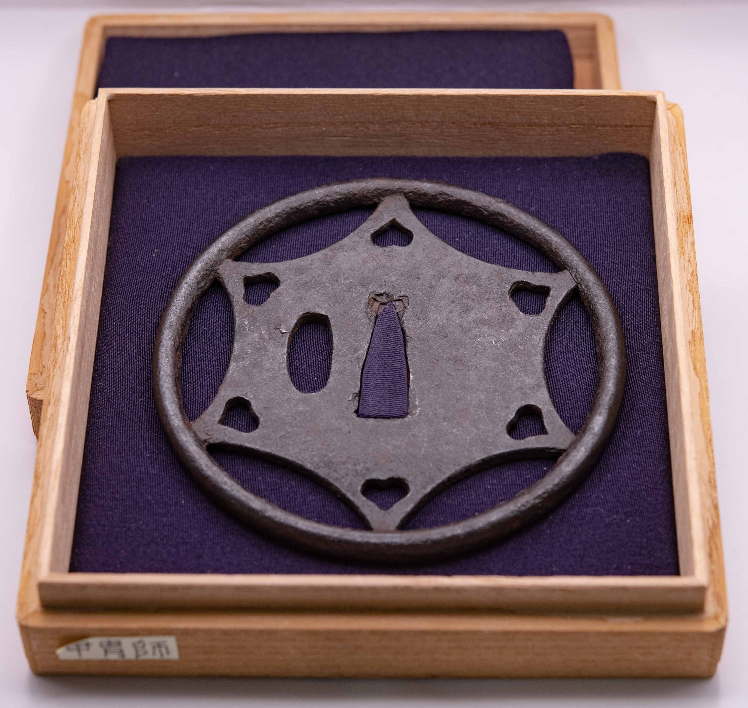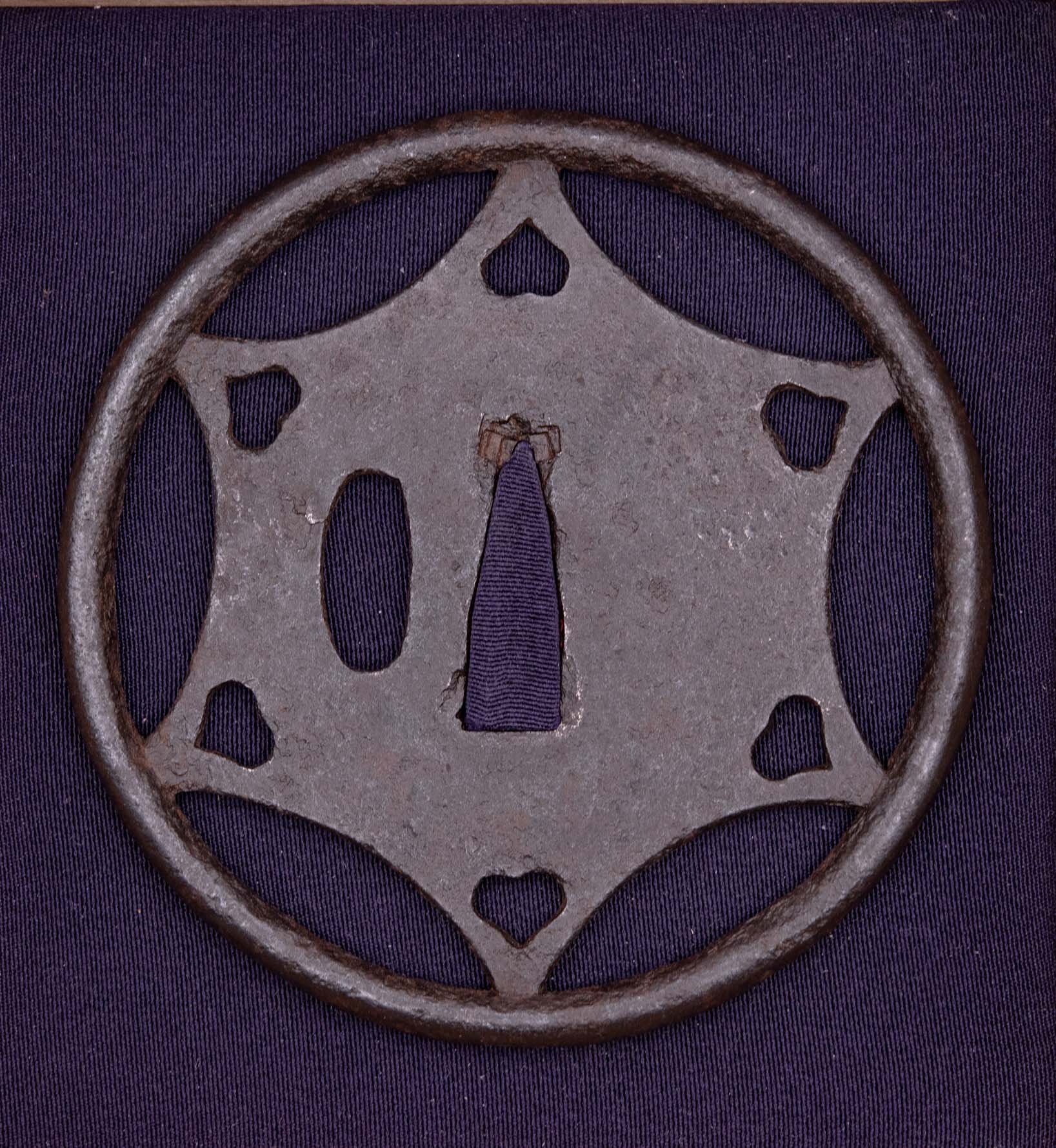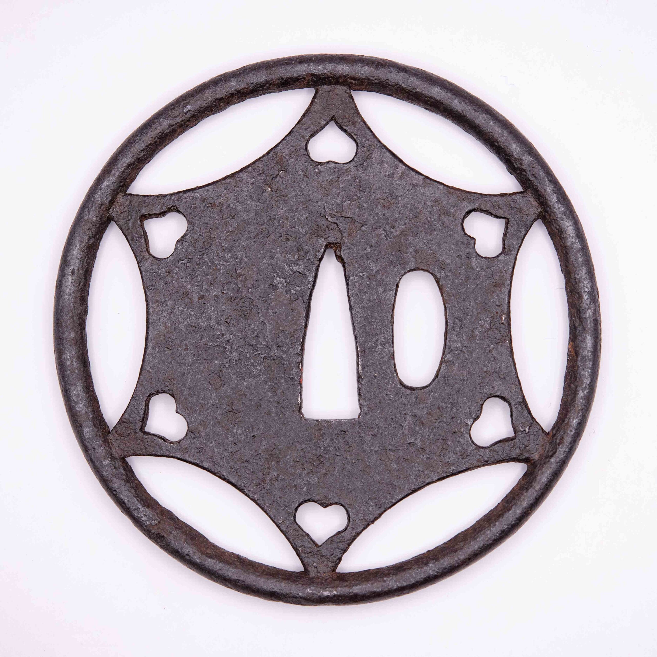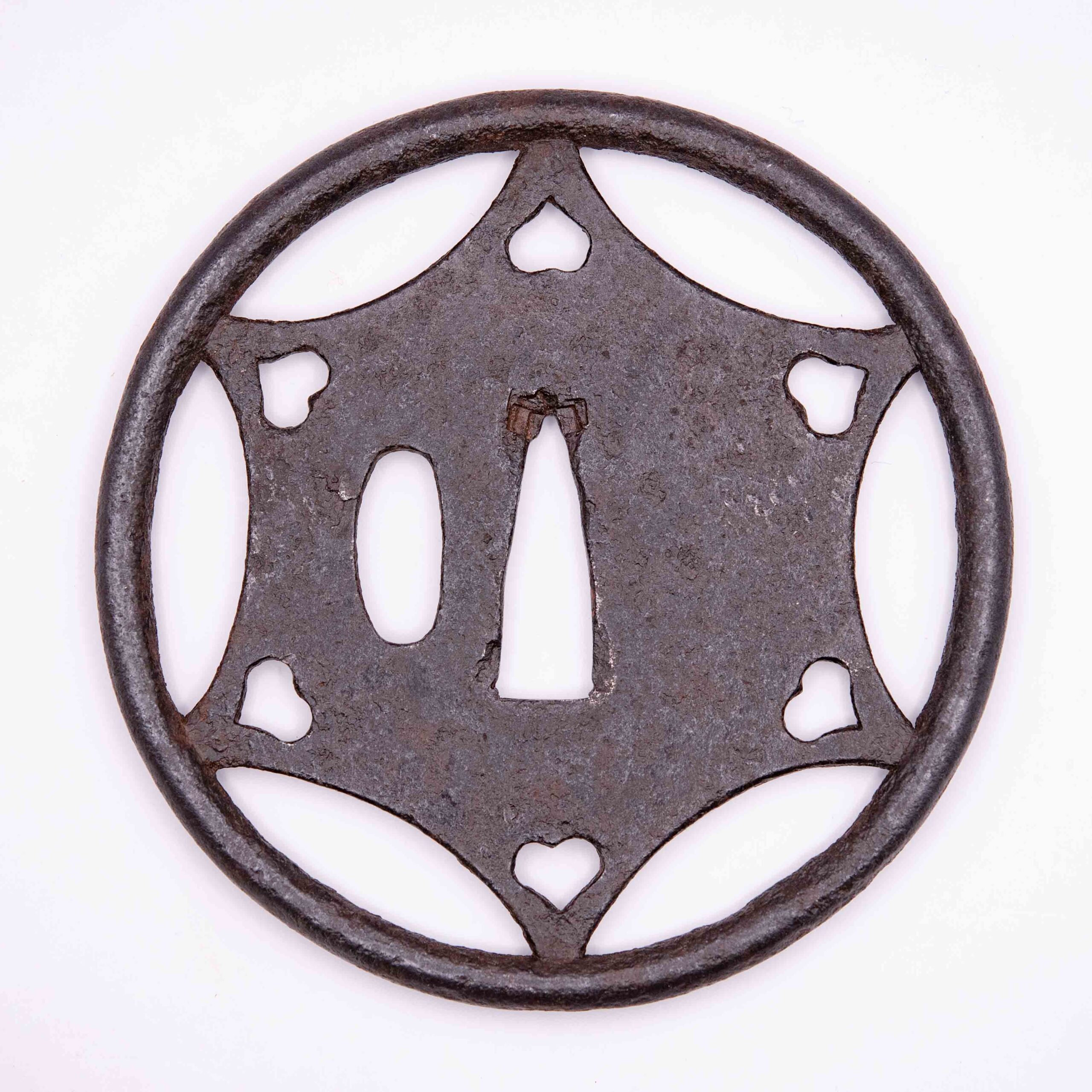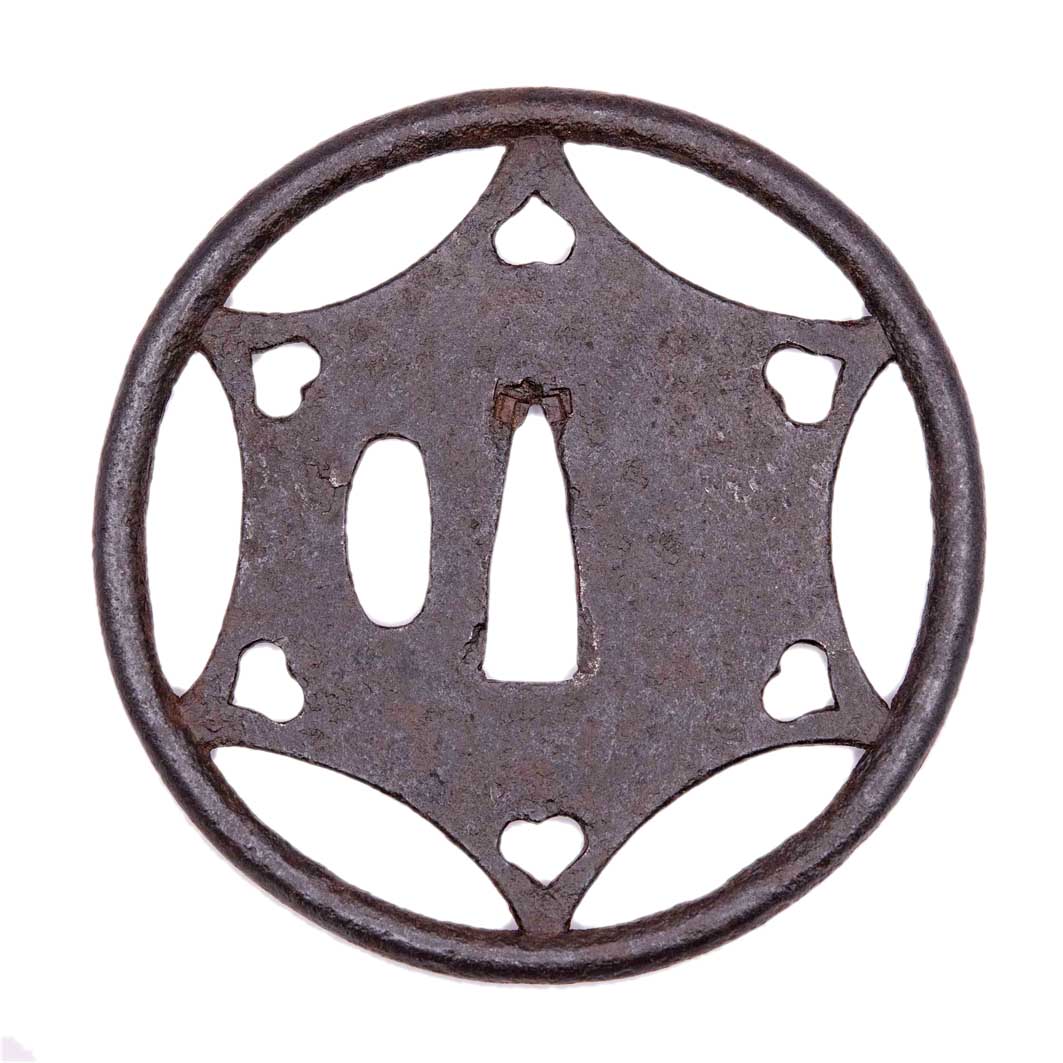 This rare and large Ko-Kachushi Tsuba must date back to the Nanbokucho or early Muromachi period. By the size of the piece which is almost 10 cm in diameter we can assume the size of the blade this must have been mounted on once. The bold and symmetric design adds to the overall quiet elegance of the piece which is set in a thick round rim. We can see a mixture of Ji and Ko Sukashi elements with the Star in Ji-Sukashi and the heartshaped boar’s eyes in Ko-Sukashi. The Hitsuana bears the slightly elongated form typical to old Tsuba.