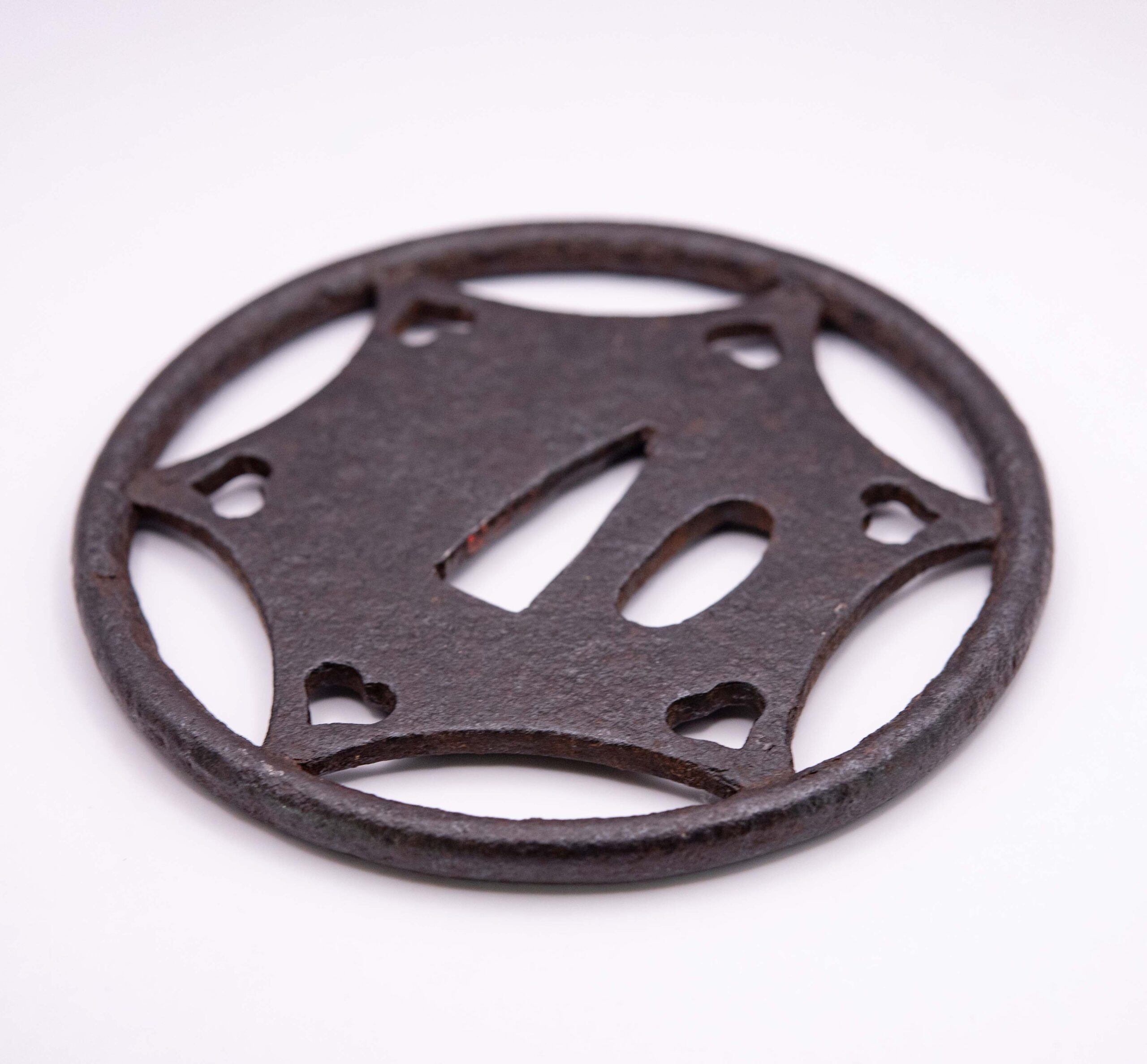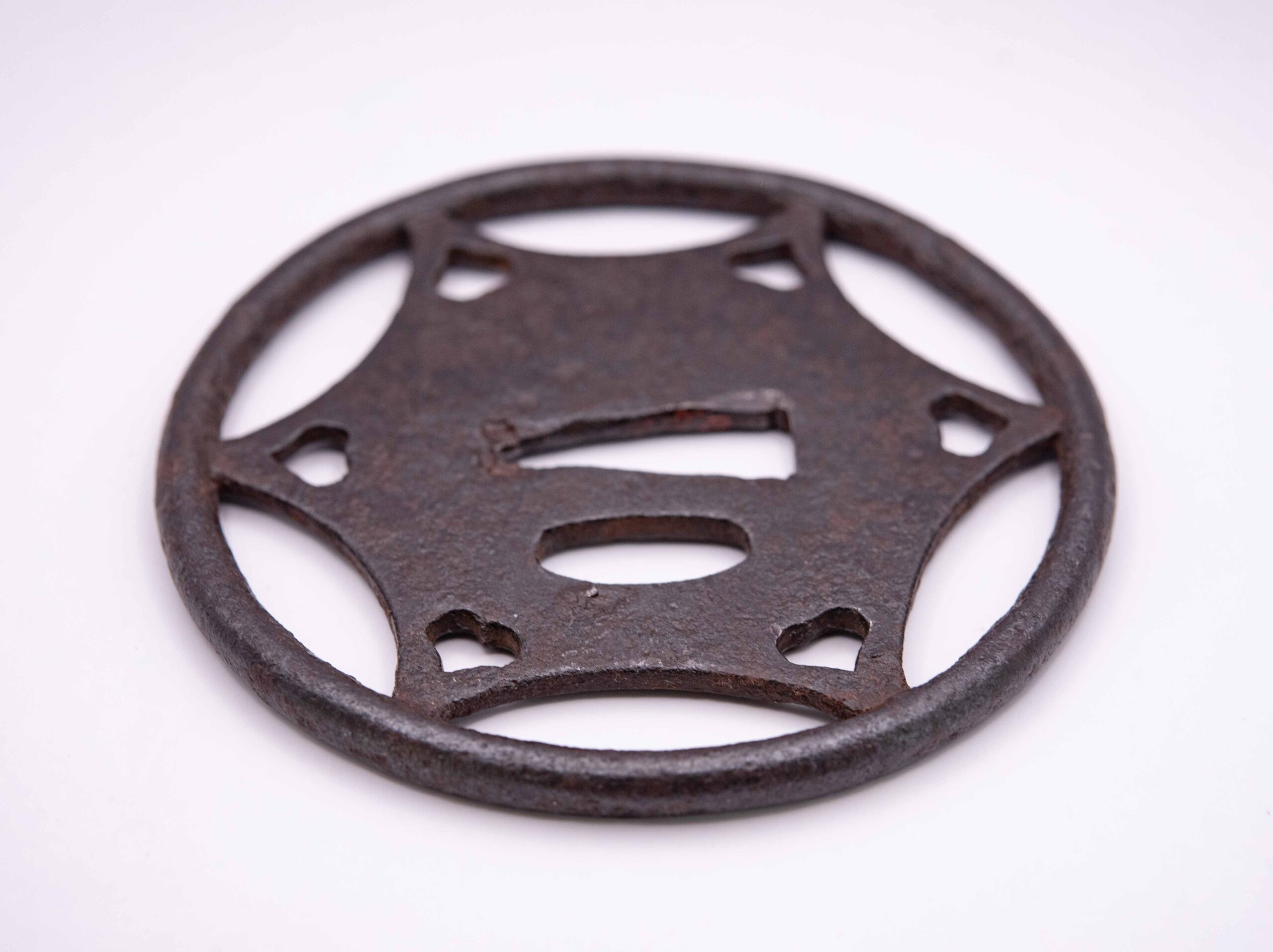 Ko-Kachushi Tsuba date back to the Kamakura era and share many characteristics with Ko-Tosho Tsuba but they show a distinct rim or more complicated and larger openworks. Due to the similarity of their steel to Japanese Helmets and the way their rims are crafted they might have been made by armorers and makers of helmets.